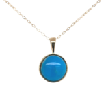 14k yellow gold Ithaca peak turquoise pendant. Ithaca Peak turquoise comes from the Cerbat Mountains in Mohave County. It is part of the Kingman mining operations turquoise from Arizona, which is the last full-time production mine in the US. The round turquoise measures about 10mm and weighs 3.50 carats. The turquoise is a true blue color with a little veining on the left side.