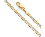 The 14k tri-tone gold 2.6 mm diamond-cut Star Valentino chain bracelet presents a stunning blend of craftsmanship and design. Composed of genuine 14-karat yellow gold, each link is meticulously crafted in a diamond-cut oval shape. Notably, the bracelet features square designs at the center of each link, alternating in rose gold and white gold, highlighted with a diamond-cut starburst pattern. This tri-color composition, along with the intricately designed links, creates a captivating visual appeal.