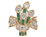 Retro 14k yellow gold ring featuring a diamond bouquet of tulip flowers with emerald stems. There are nine round diamonds of which three are round brilliant cuts and six are transitional to European cut. The largest diamond measures about 3.7mm The diamonds have SI clarity and H-I color. There are ten emeralds of the period, likely synthetic or glass, which have been cut in various shapes.