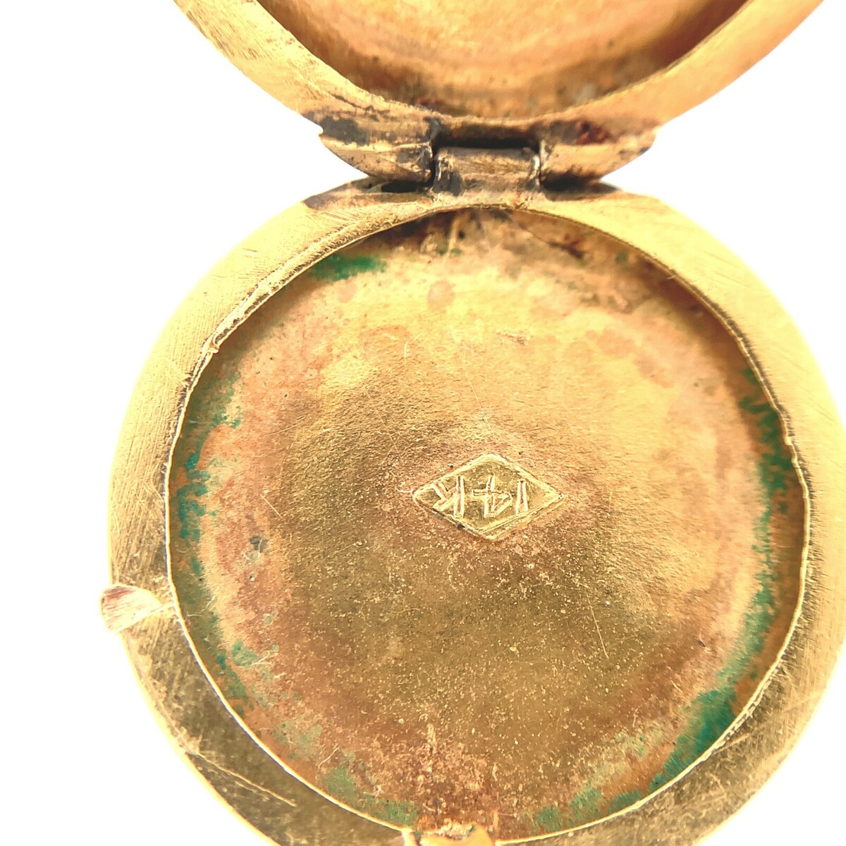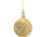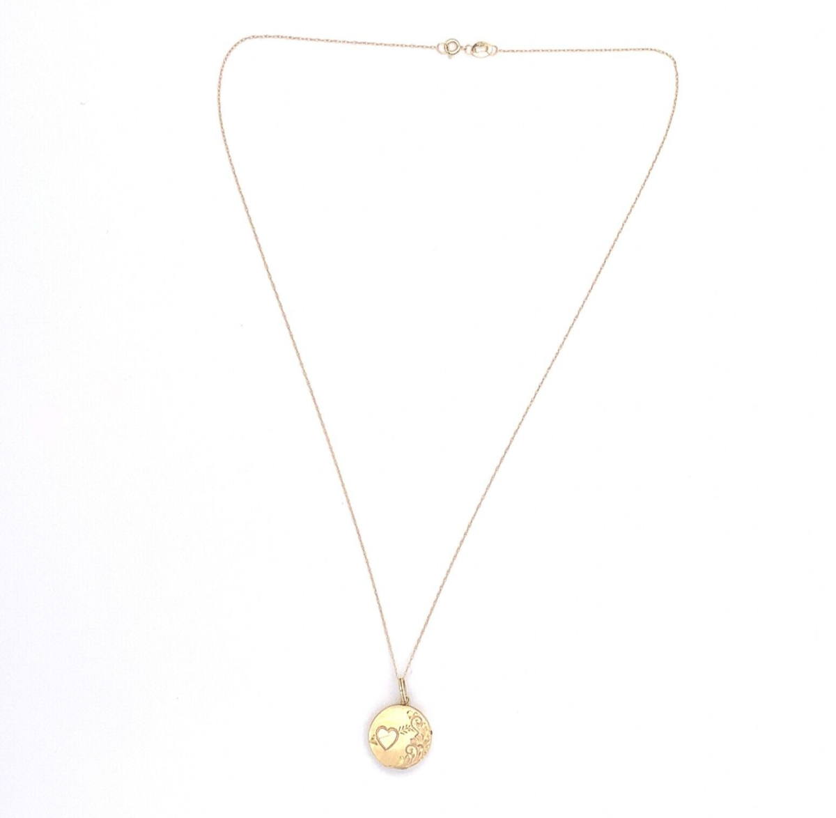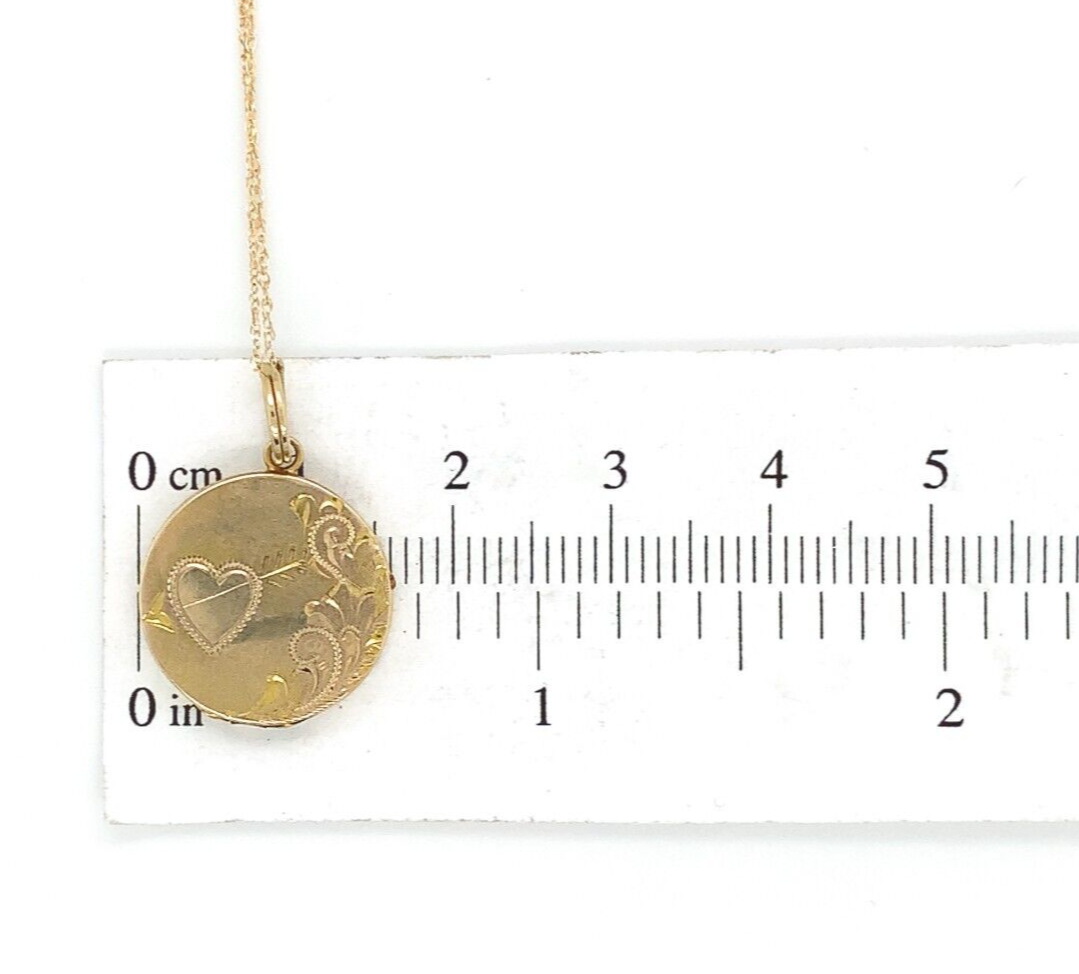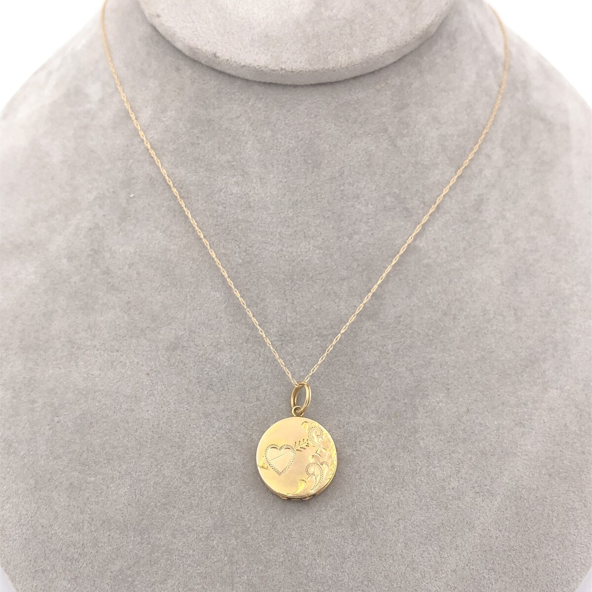 14k yellow gold round locket on chain. The locket measures just under 1" long with bail by 5/8" diameter locket. The locket is engraved with and arrow through a heart and scroll work. The pendant includes a new 18" 14k yellow gold chain. The necklace weighs 1.59 dwt., and the locket dates from about 1940. The bail is a threaded jump ring. Terrific! Note: There are a few dents on the reverse as well as a small cut mark where it was likely tested.