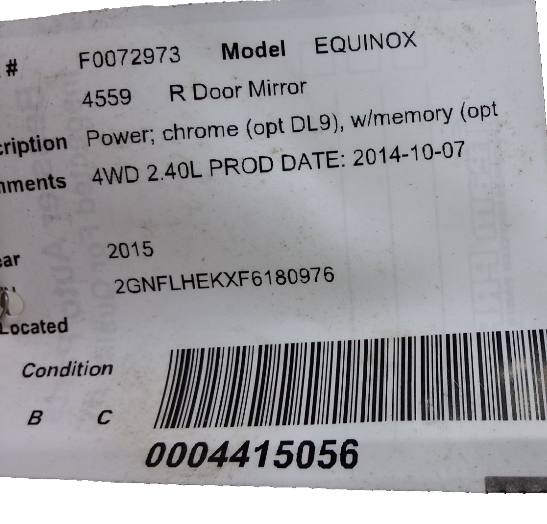 2015 to 2017 Chevrolet Equinox, GMC Terrain, right passenger side chrome door mirror with heat and memory. 9 wires to the plug. Part number 23467288.