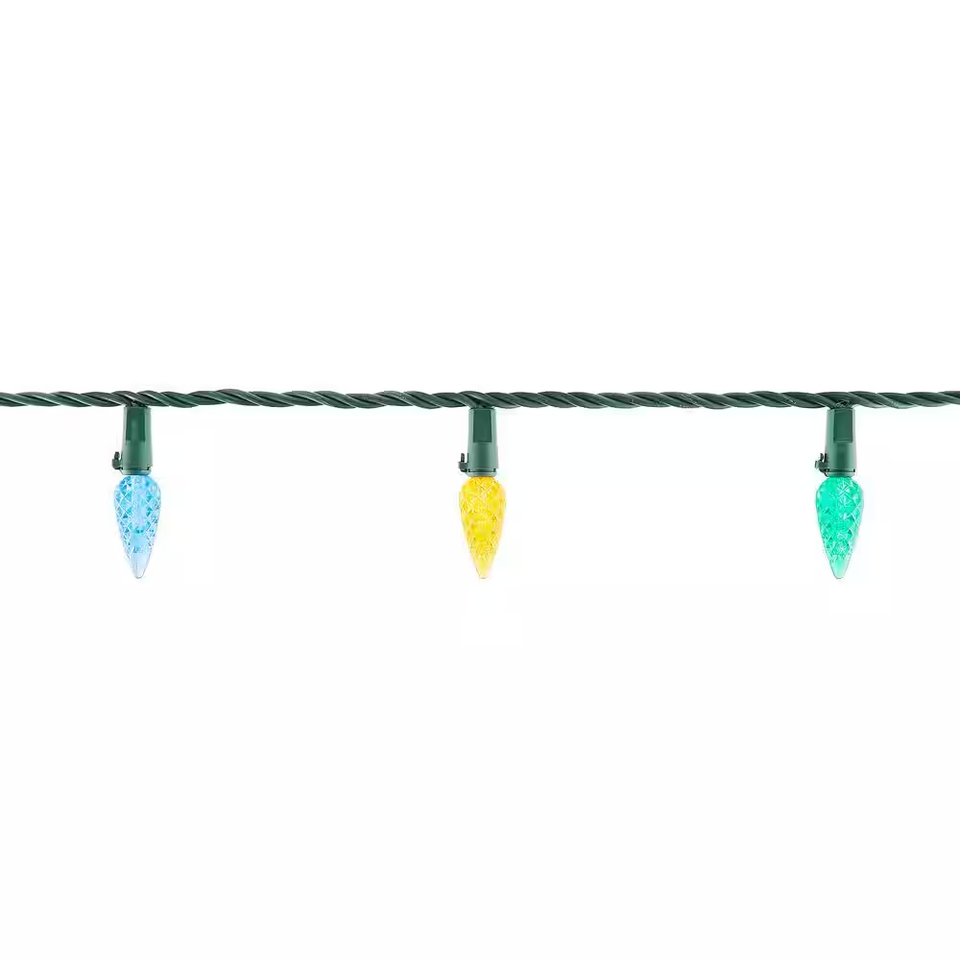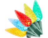 Create a dazzling display with these Home Accents Holiday 150 Count Multi-Colored Faceted C6 LED Lights. These LED lights are cool to touch when lit. There is 49 ft. 8 in. of lighted length to use along gutters, in trees, along fence or anywhere you want to create an outdoor light show. These lights can also be used indoors along railings or wall trimmings. They connect up to 30 sets on one outlet for an even more dramatic display of light. These multi-colored faceted lights are long lasting up to 25,000 hours (up to 15 holiday seasons). These C6 lights have a green wire and include three spare bulbs and two fuses.