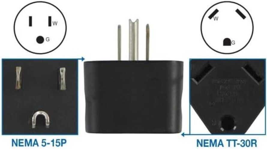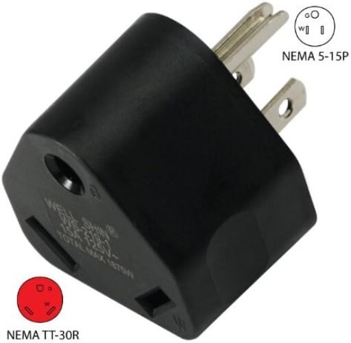 RV Camp Power Adapter: Specifications: 15A 125V to 30A 125V, NEMA 5-15P to NEMA TT-30R.
