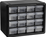 The Akro-Mils 10116 16-Drawer Plastic Storage Cabinet Organizer with Drawers is a great solution for all your storage needs. This heavy-duty cabinet is made in the U.S.A. from rugged, high-impact polystyrene plastic and features 26 large and small plastic drawers offering ample storage space for all your small parts and tools. Plastic organizer drawers inside dimensions: 5-1/4-Inch x 1-11/16-Inch x 1-1/2-Inch. Whether you're looking to organize your garage, workshop, classroom, or home, this storage cabinet has you covered. Garage owners and businesses will love the versatility of this cabinet, with the plastic storage drawers perfect for use as a hardware organizer, screw organizer box, or for battery storage. Keep your nails and other small parts accessible with ease. Teachers can use the cabinet for classroom storage, as a teacher toolbox, art storage, craft storage box, for scrapbook supplies, and more. This plastic storage cabinet is also perfect for home storage and organization. Use it as a lego organizer, craft organizer, hobby organizer, or bead storage organizer. It's even great for makeup storage and organization or for medicine and first aid supplies. And with the ability to stack cabinets securely or wall-mount them using keyhole slots, along with finger-grip drawer pulls and rear stop tabs to prevent contents from spilling, this cabinet has everything you need to keep your items safe and organized. Cabinets have dividers included. Included dividers are molded into the back of the cabinet (remove with scissors). Additional dividers can be purchased separately.
