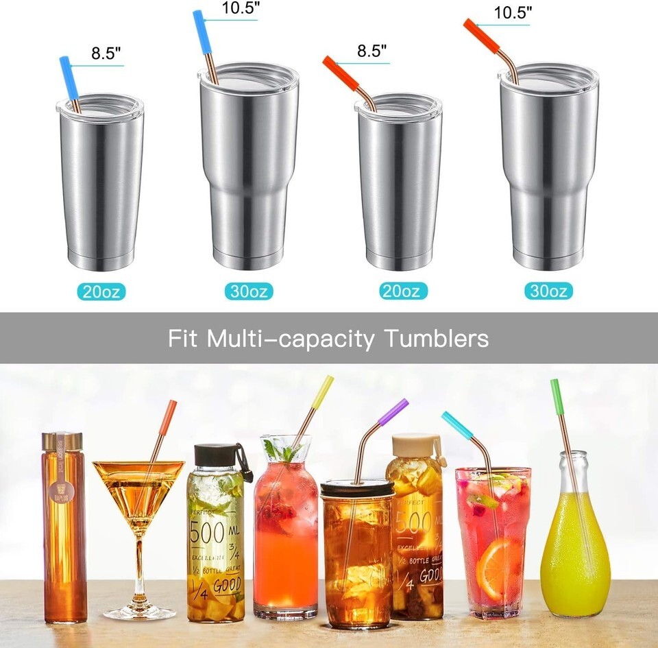 Two sizes: 8 pieces of 10.5-inch ultra-long straws for larger tumblers (24 oz to 34 oz) and 8 pieces of 8.5-inch regular straws for smaller mugs (16 oz to 20 oz).