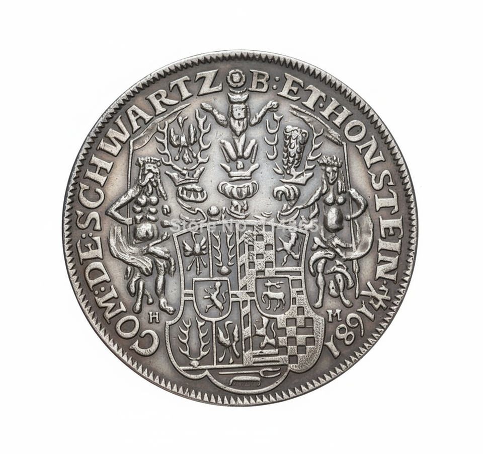 Entdecken Sie diese exquisite Anton Günther Schwarzburg-Ebersdorf Fantasy-Kunstmedaille-Nachpragung von 1684, ein wahrhaft bemerkenswertes Sammlerstück für Numismatiker. Dieses historische Zeichen, eine detaillierte Nachpragung, erinnert an eine ra komplizierter europaischer Adelshauser. Die Vorderseite zeigt eine fein gerenderte Büste von Anton Günther, Graf von Oldenburg, aufwendig dargestellt aus dem 17. Jahrhundert mit einer großen Perücke und drapierter Kleidung, die ein starkes Profil zeigt. Die Rückseite ist eine aufwendige Darstellung der Heraldik, darunter die mit Schwarzburg-Ebersdorf verbundenen komplexen Wappen, flankiert von gekronten mythologischen Figuren und überragt von zusatzlichen Wappen, alle datiert 1684. Dieses schone Gedenkstück ist ein außergewohnliches Sammlerstück und bietet eine proof-ahnliche Oberflache, die seine komplizierten Details hervorhebt. Es dient als faszinierendes Kunstwerk, das die reiche Geschichte und künstlerische Handwerkskunst dieser Zeit widerspiegelt. Eine perfekte Erganzung für jeden ernsthaften Sammler historischer Medaillen und Wertmarken.