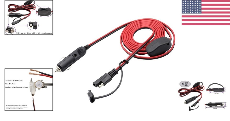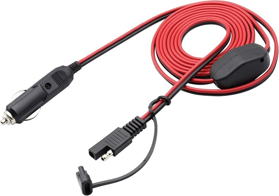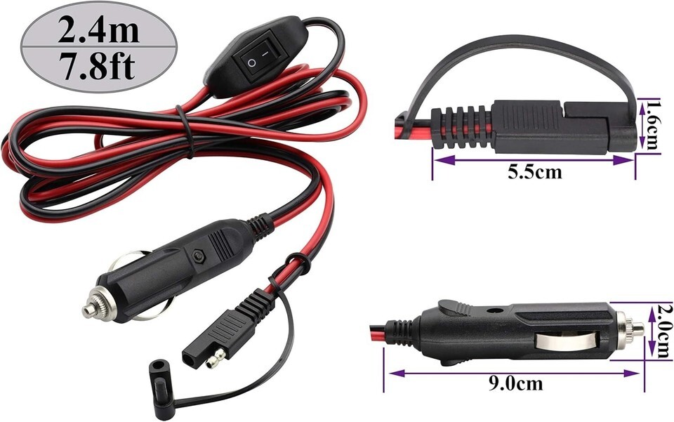 - 16AWG 12V Cigarette Lighter to SAE Connector Cable with Switch - 2.4m