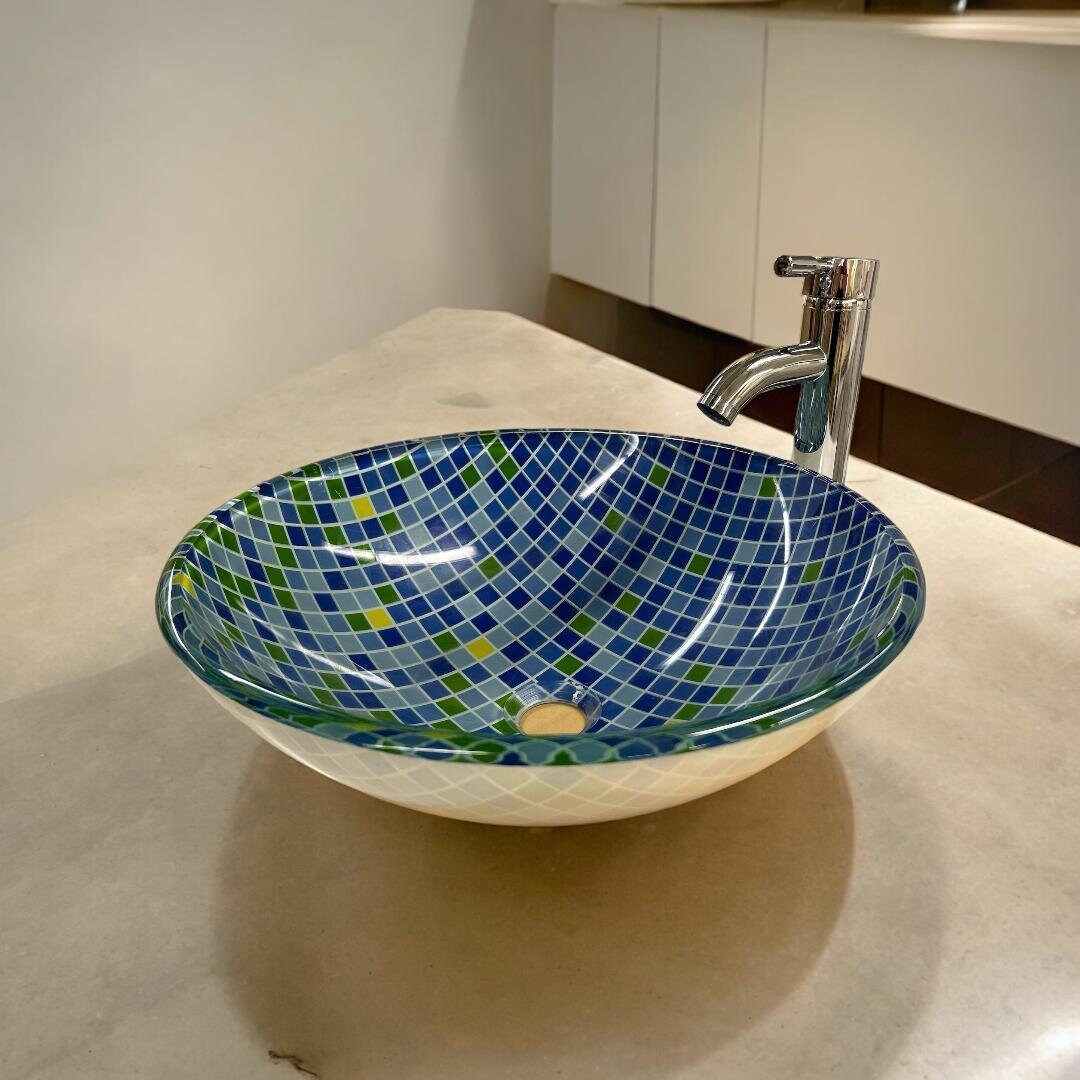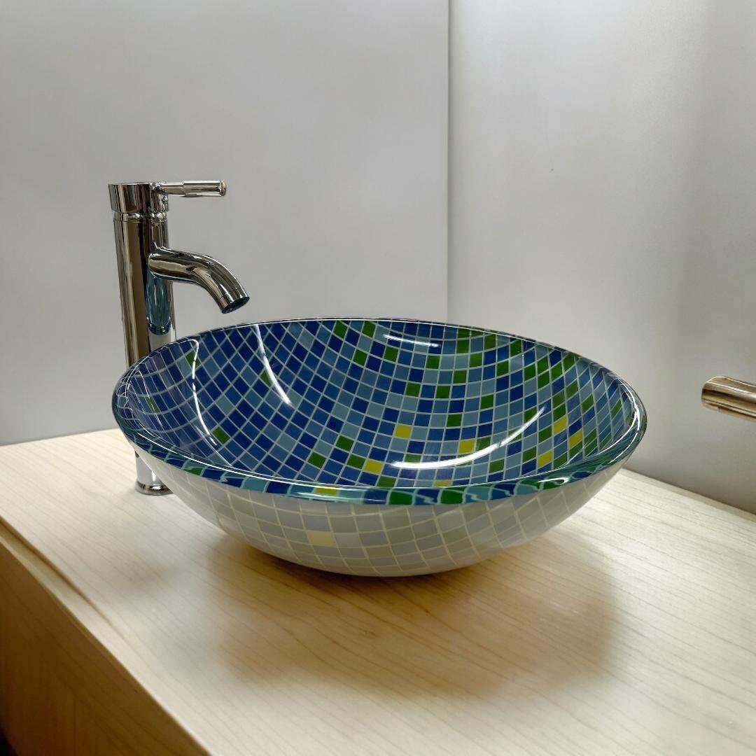 17" Light and Dark Blue Pattern Handmade Tempered Glass Bowl Vessel Above Counter Sink