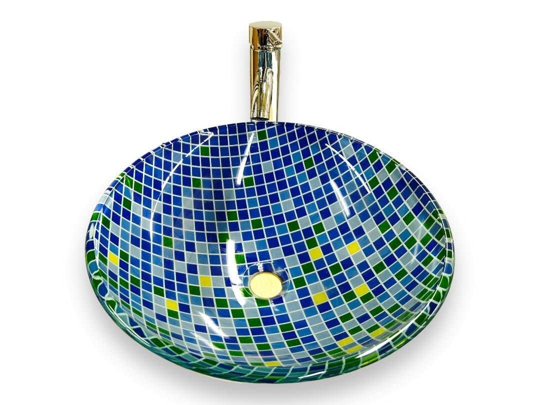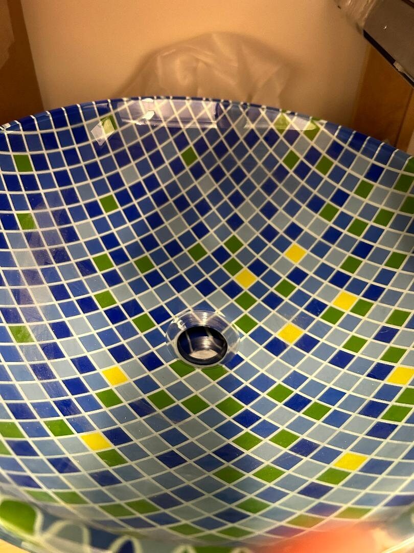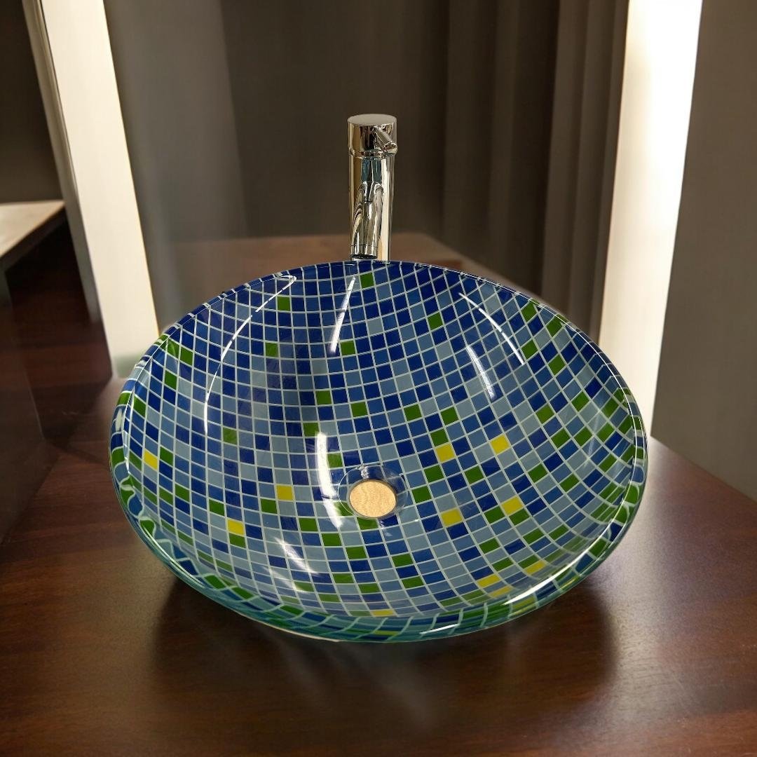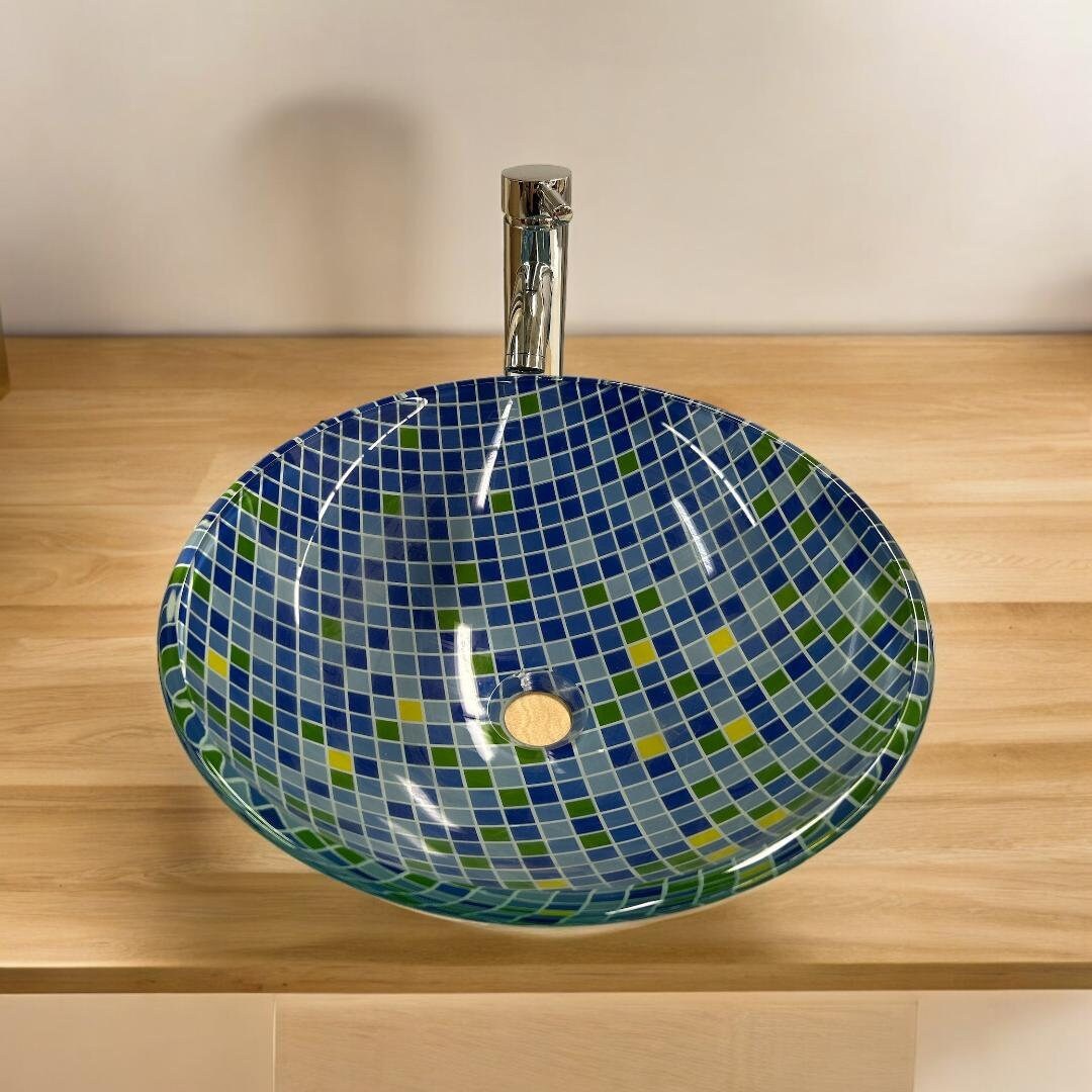 - 17" Multicolor Checkered Pattern Handmade Tempered Glass Bowl Vessel Above Count