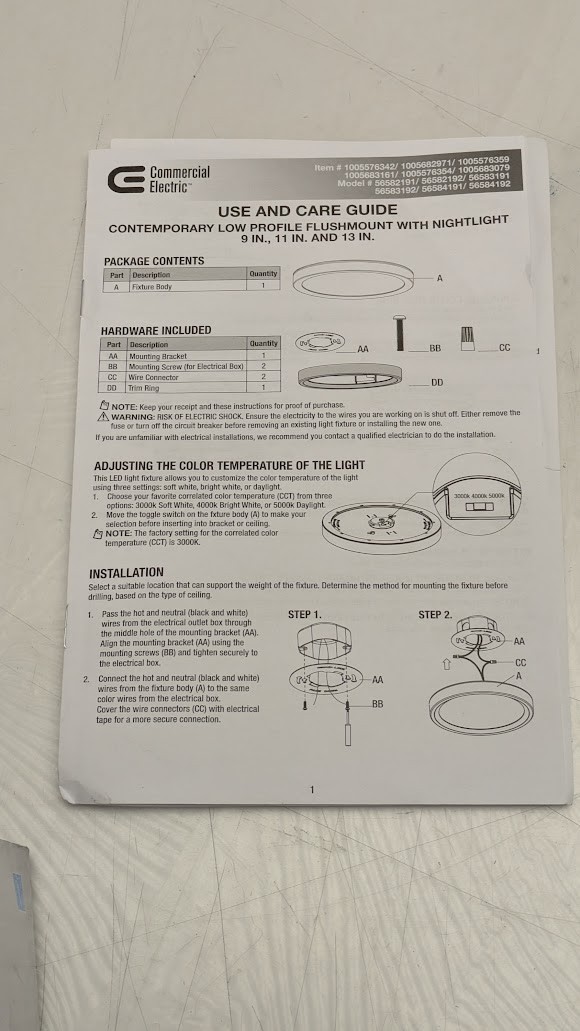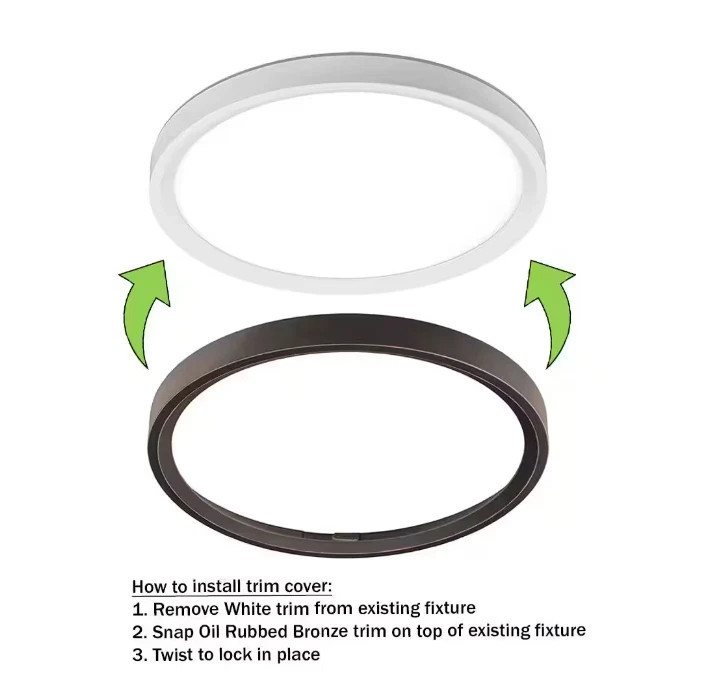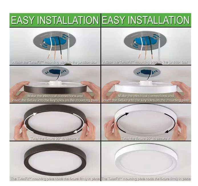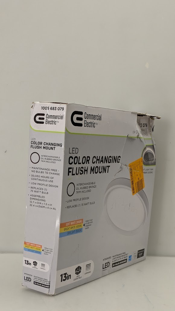 Commercial Electric Low Profile 13in. LED Flush Mount ceiling light is the perfect way to update your lighting by replacing outdated incandescent bulbs with an energy-efficient integrated LED fixture. Prior to installation, keep the existing White trim or choose the Oil Rubbed Bronze trim to add a little pop of color into your space. Additionally, select between 3 color temperatures of light output: Soft White, Bright White or Daylight using the slide switch on the back of the fixture. Activate the Night Light feature which emits a Soft Amber glow around the fixture providing warm ambient accent lighting. Our innovative mounting system allows for quick installation into existing junction boxes using the TwistFit mounting bracket. (included) This flush mount is maintenance free with no bulbs required and lasts up to 50,000 hours. Great for kitchen, pantry, bedrooms, bathrooms, closets, stairways, hallways, basement, laundry room, craft room, playroom, den/office, retail store or boutique.