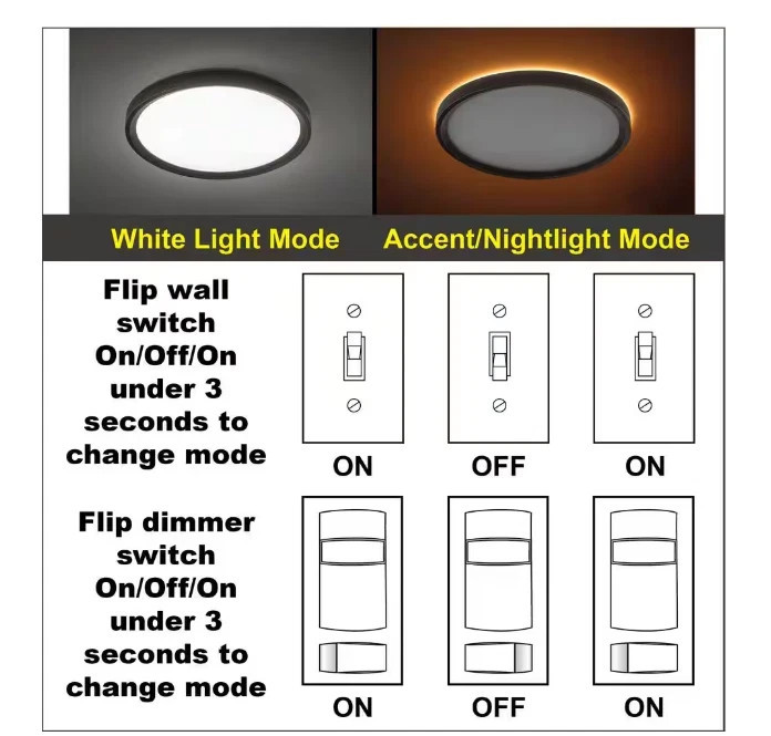 NIGHT LIGHT MODE: Illuminates 2000K Soft Amber glow around the fixture when activated from your wall switch - Ideal for warm ambient lighting - To activate Night Light Mode, quickly toggle your wall switch ON/OFF/ON