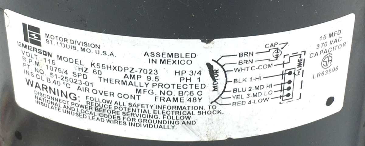 This is Emerson K55HXDPZ-7023 Blower Motor 3/4HP 115V 1075RPM 4SPD 51-25023-01 used part, comes with a brand new capacitor.