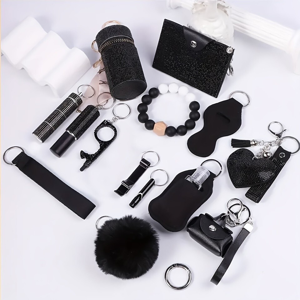 This premium 17-in-1 Women?s Safety Keychain Set gives you everything you need to stay prepared, organised and stylish on the go. Packed with essential mini-accessories including wrist strap, card holder, pom-pom, rhinestone bottles, whistle, beaded bracelet, storage purse and more.