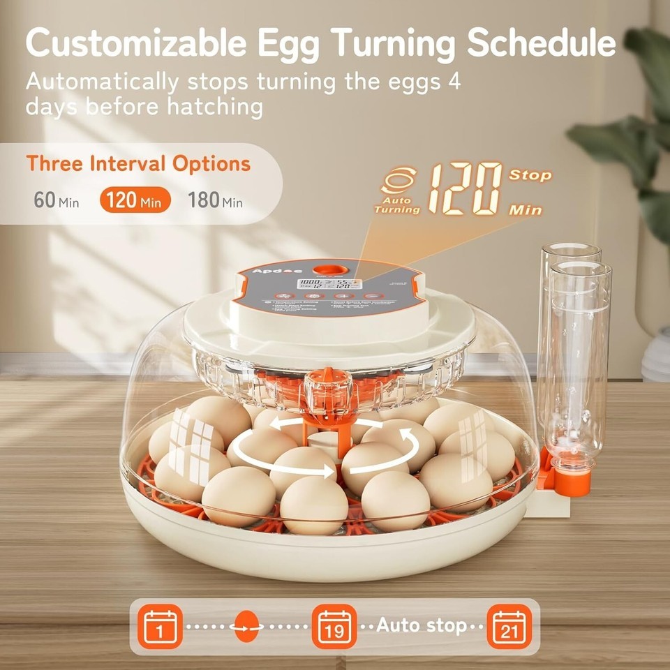 Enhanced Egg Turning Feature: Automatic turning function that stops 4 days prior to hatching with a customizable countdown timer. Choose turning intervals of 60, 120, or 180 minutes to best suit your needs.