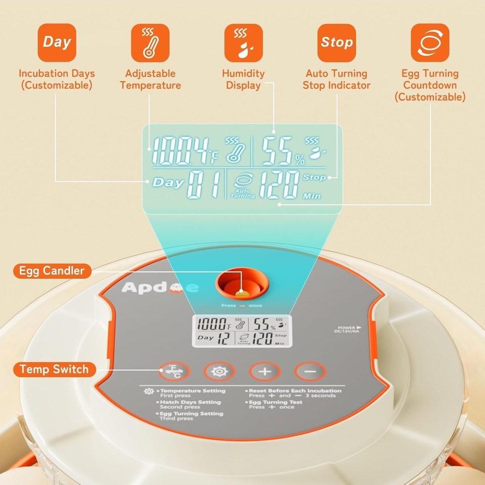Multifunctional Incubation Data: Enjoy a user-friendly display showing incubation days, egg turning countdown, auto-turning status, temperature, and humidity levels for complete visibility.