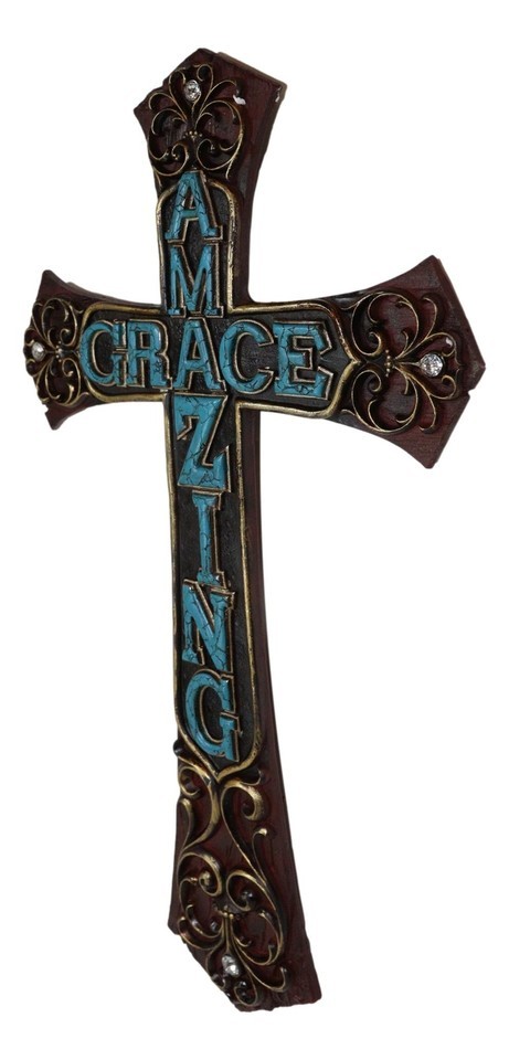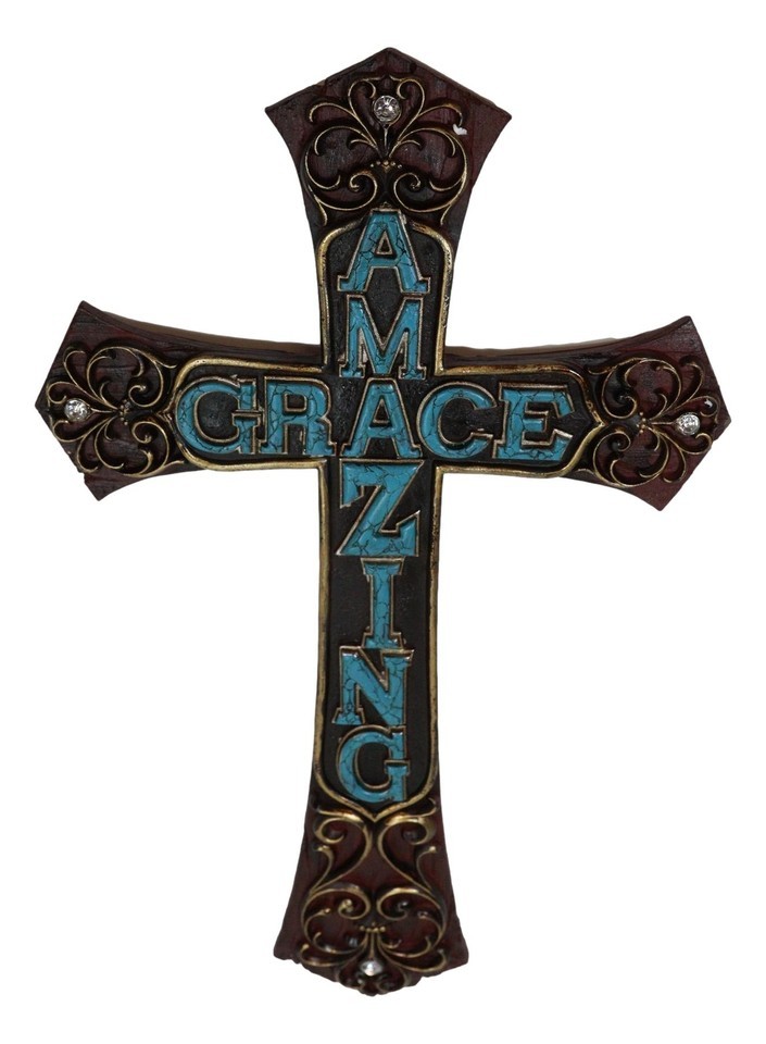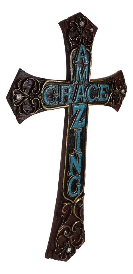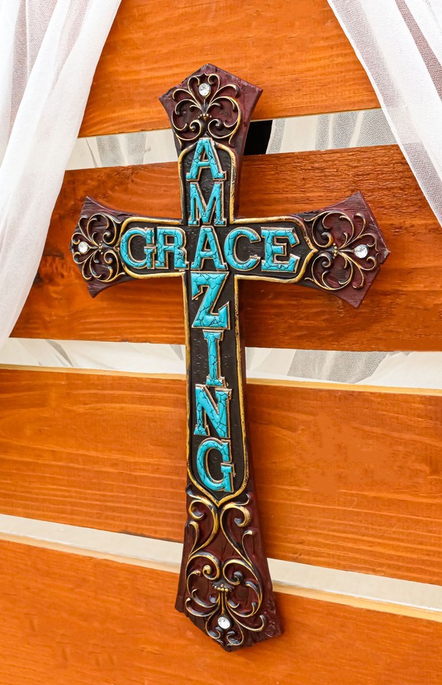 - 18"H Rustic Western Faux Wooden Amazing Grace Scrollwork Decorative Wall Cross