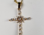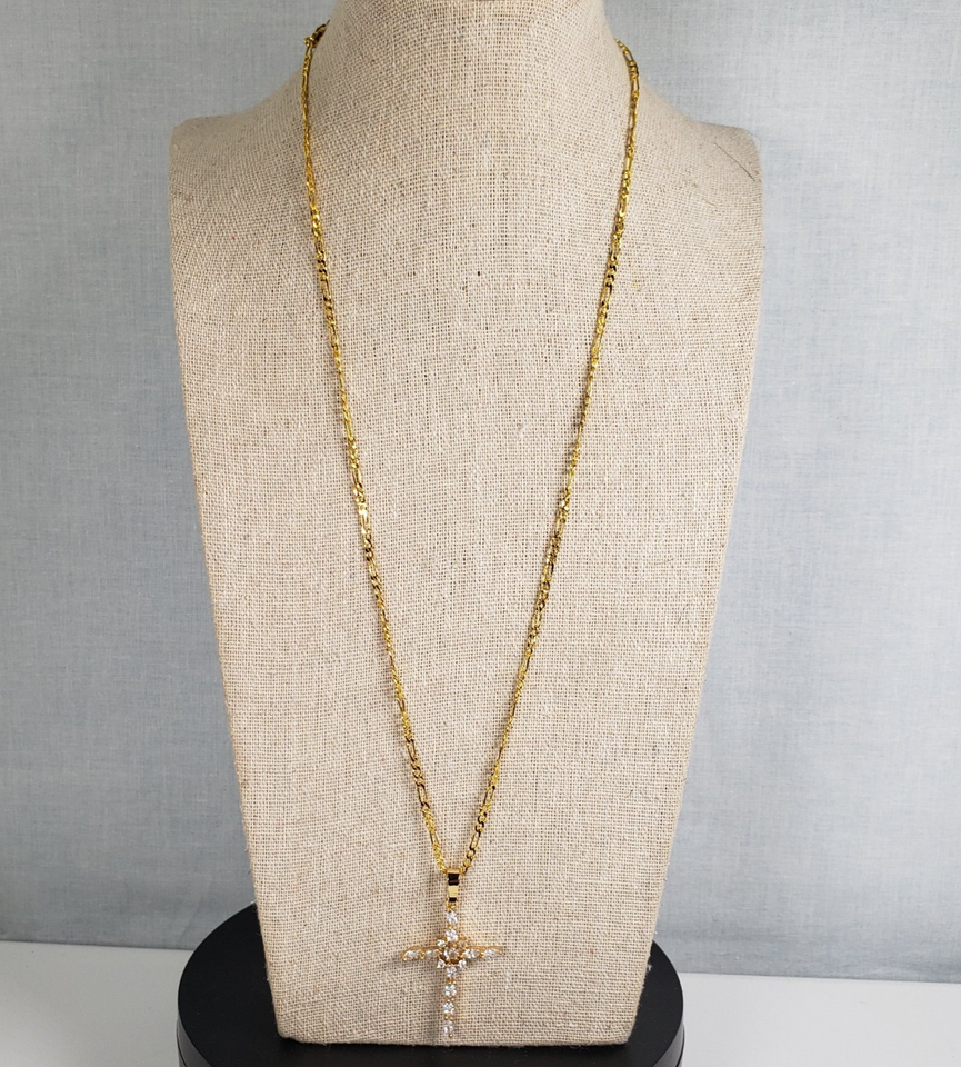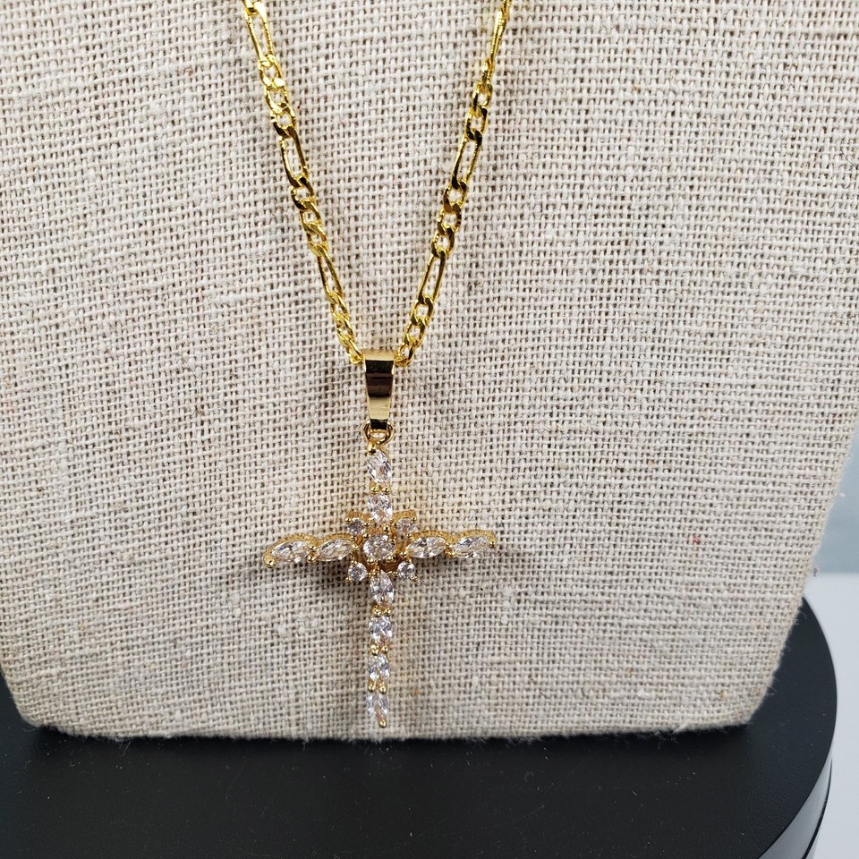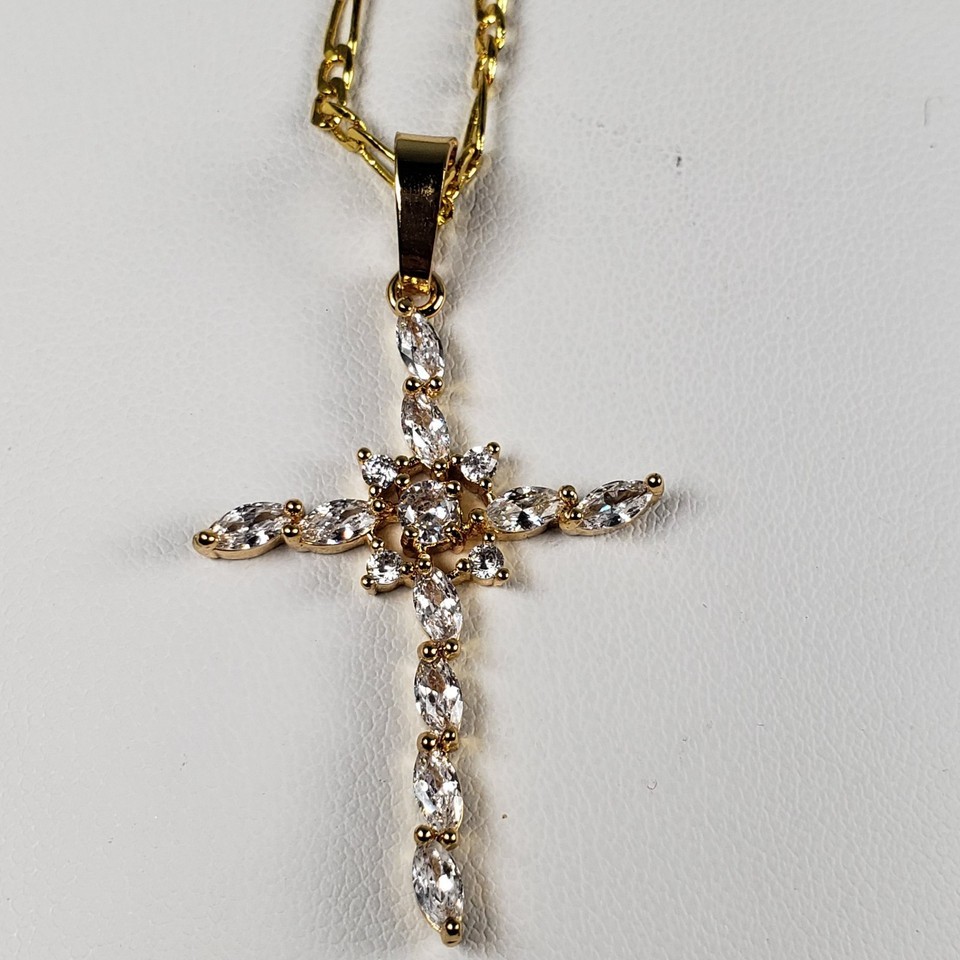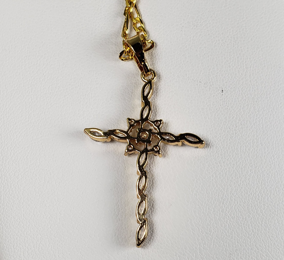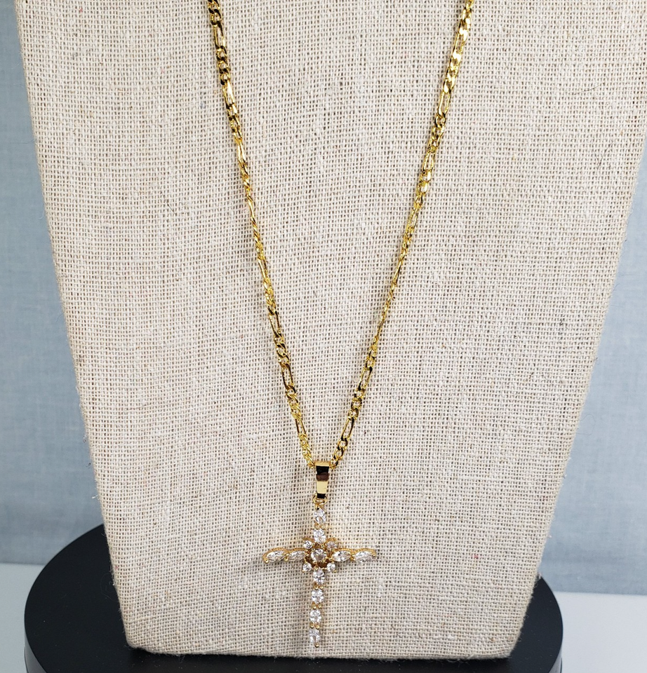 18 kt Gold Filled Hollow Clear Marquee Crystal Cross with 21" Figaro Chain