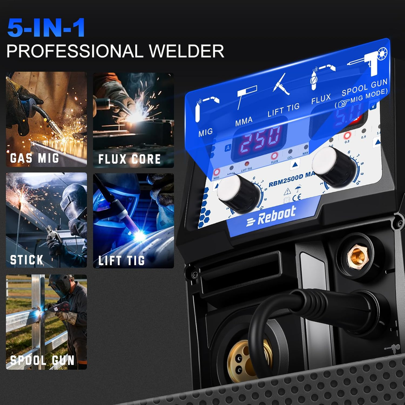 TRUE 5-IN-1 WELDING VERSATILITY: Master any project with 5 distinct processes: MIG (with gas), Flux-Cored (gasless), Stick (MMA), Lift TIG, and Spool Gun Compatibility. This multiprocess welder handles steel, stainless steel, and aluminum with ease, making it your all-in-one workshop solution.