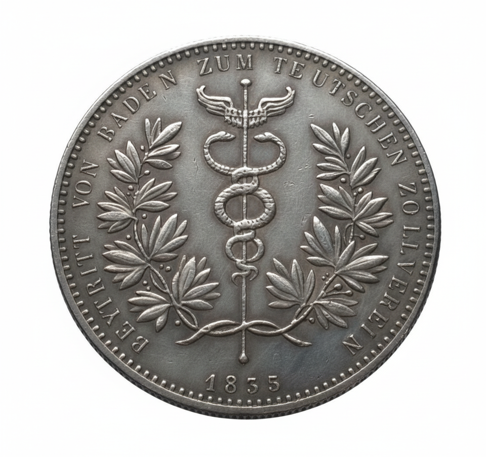Descubre esta exquisita medalla de arte Zollverein aleman de 1835 Ludwig I Bavaria restrike, un coleccionable verdaderamente notable. Esta pieza conmemorativa historica celebra un momento crucial en la historia alemana del siglo XIX: la entrada de Baden en el Teutschen Zollverein, la Union Aduanera Alemana. Con un retrato finamente detallado de Luis I, rey de Baviera, en el anverso, y un caduceo simbolico dentro de una corona de laurel en el reverso, este tesoro numismatico es un fascinante artículo de coleccionista. La leyenda 'LUDWIG I KONIG VON BAYERN' y 'BEITRITT BADEN ZUM TEUTSCHEN ZOLLVEREIN 1835' proporciona un contexto historico a esta llamativa medalla de fantasía. Ideal para entusiastas de la historia alemana y una adicion única a cualquier coleccion de fichas o piezas de arte de prueba. Una pieza importante de la herencia europea, que encarna una era de unificacion economica. Añade este token único a tu coleccion numismatica hoy.