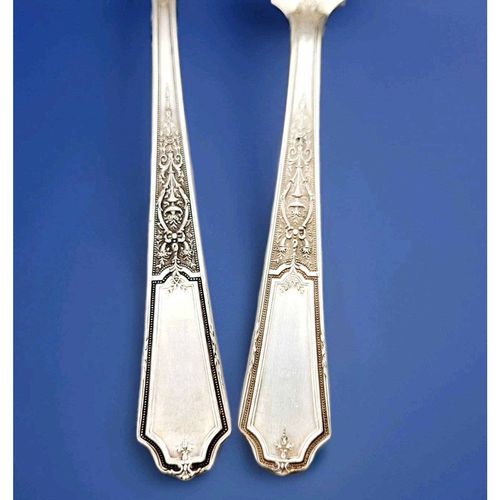 The 1847 Rogers Bros Ancestral Silverplate Butter Knife Sugar Spoon is a rare and valuable piece of antique silverware. This Victorian-style flatware, made of silverplate, features a beautiful Ancestral pattern that dates back to the early to mid-20th century. Perfect for collectors or those looking to add a touch of elegance to their dining table, this discontinued set is a timeless treasure that showcases the craftsmanship and charm of the historic era it represents.
