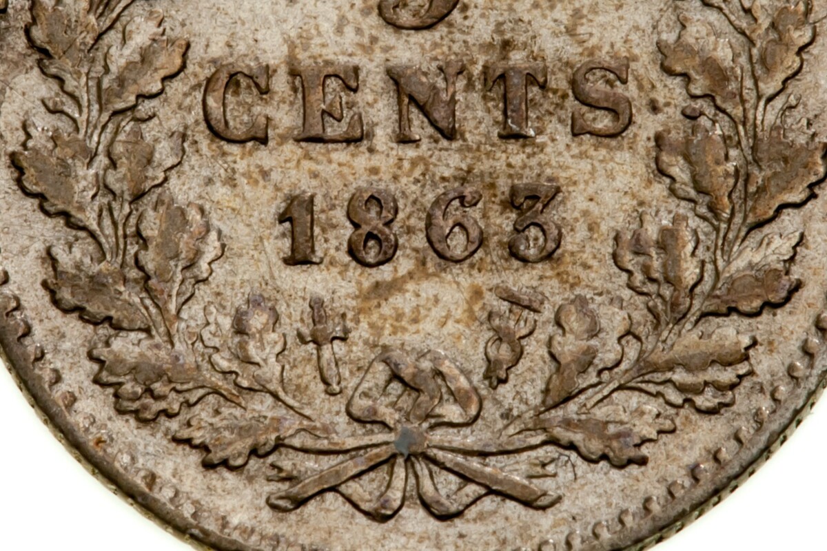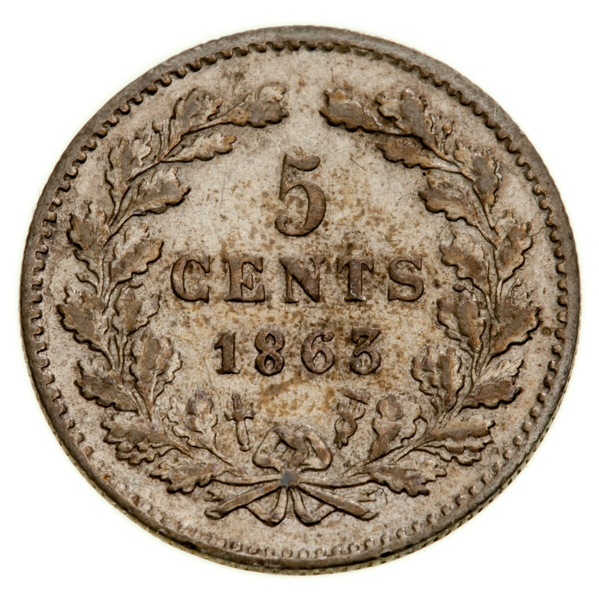 - 1863 Netherlands 5 Cents Coin in Extra Fine (XF) Condition KM 91