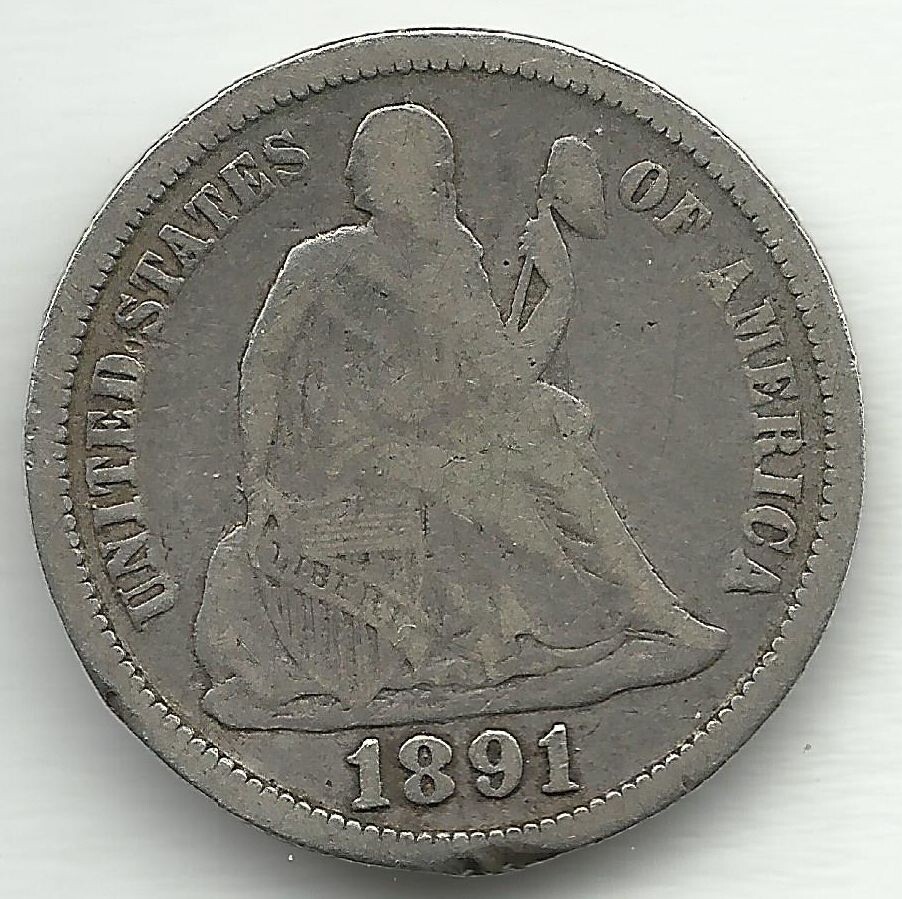 (1) 1891 SEATED LIBERTY DIME WITH NO MINT MARK. THIS COIN IS BENT AND GOUGED DINGED AT THE BOTTOM OF COIN, VIEW THE PICTURES FOR THE EXACT ITEM YOU WILL RECEIVE. YOU WILL RECEIVE ONE (1) 1891 LIBERTY SEATED EIME, AS PICTURED, SHIPPED BY USPS....