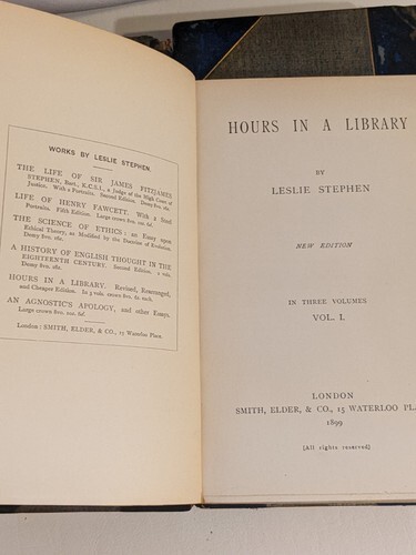 1899 Leslie Stephen Heures en Un Library 1 2 3 Vol Set Smith Elder & Co London