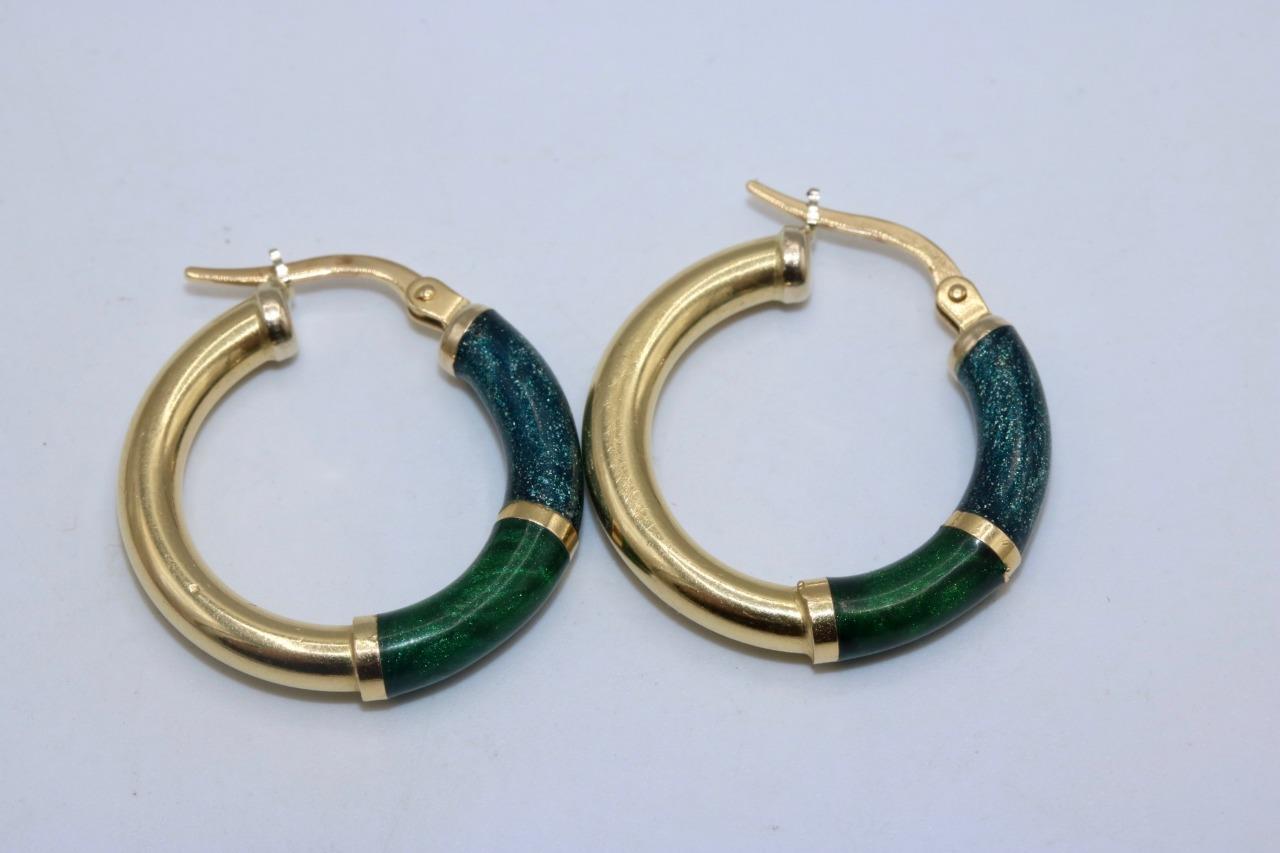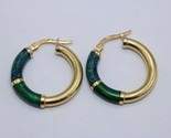 18K Yellow Gold Green Enamel Hoop Earrings 20mm 3.3 grams