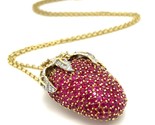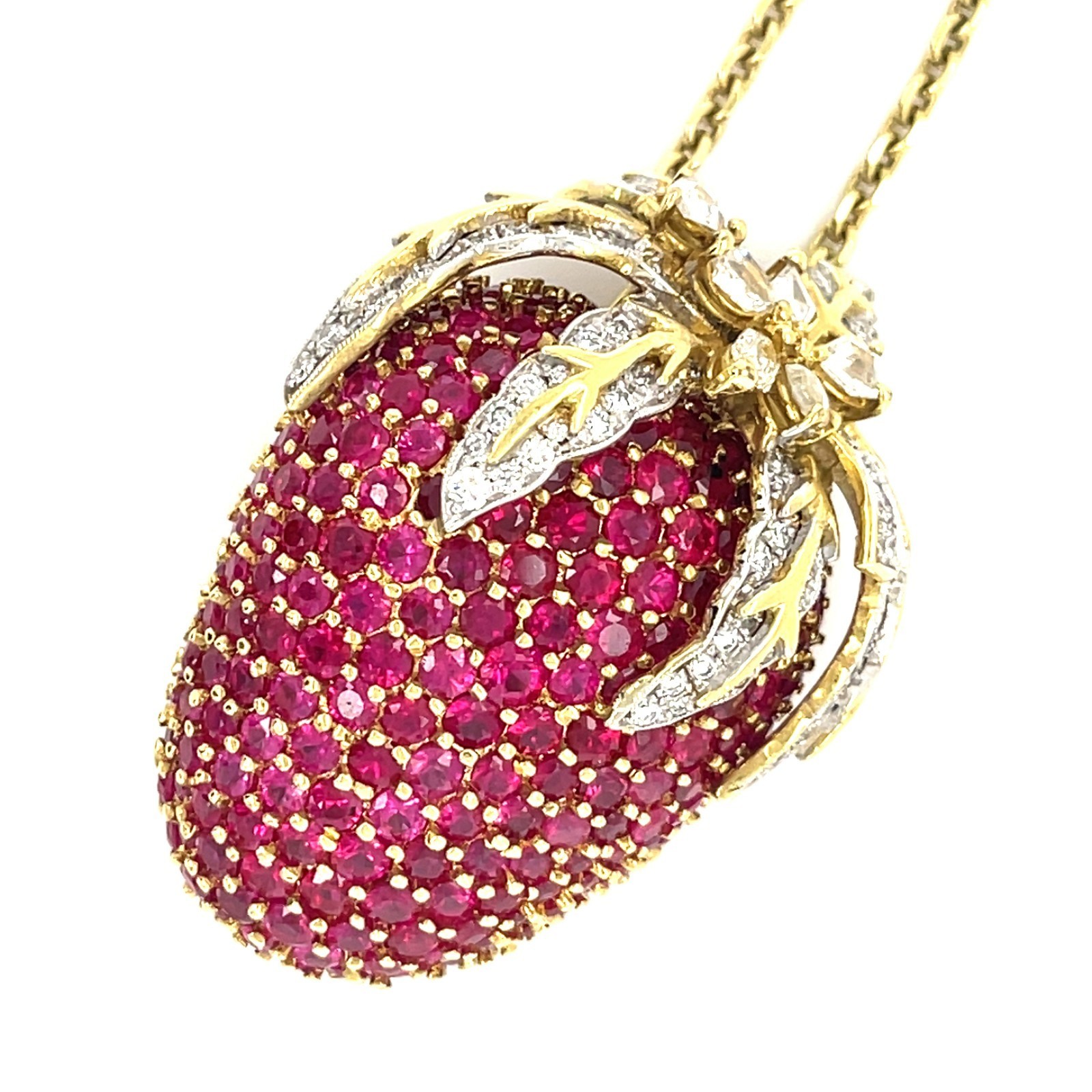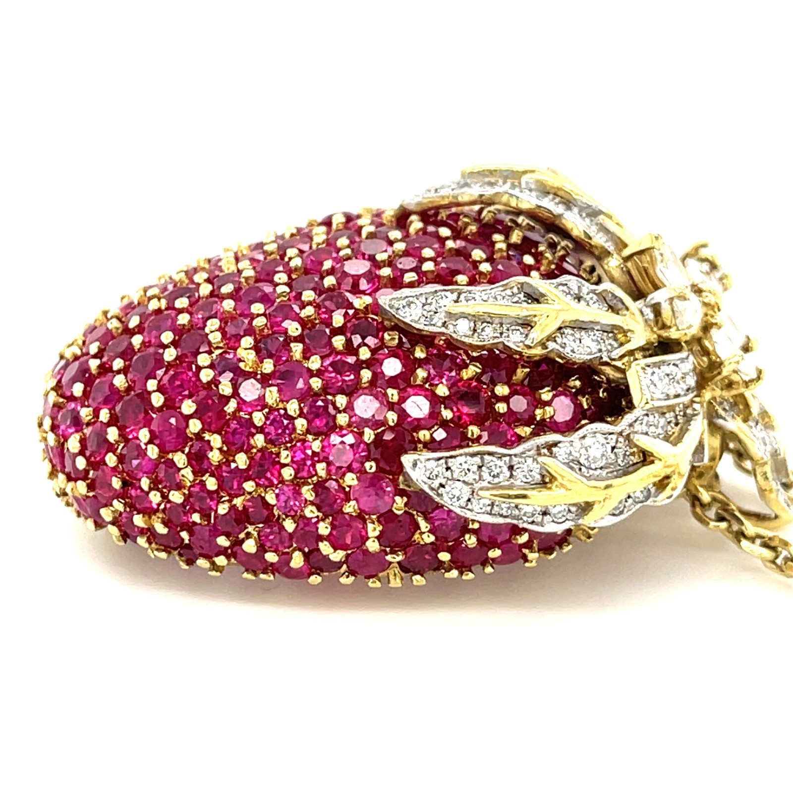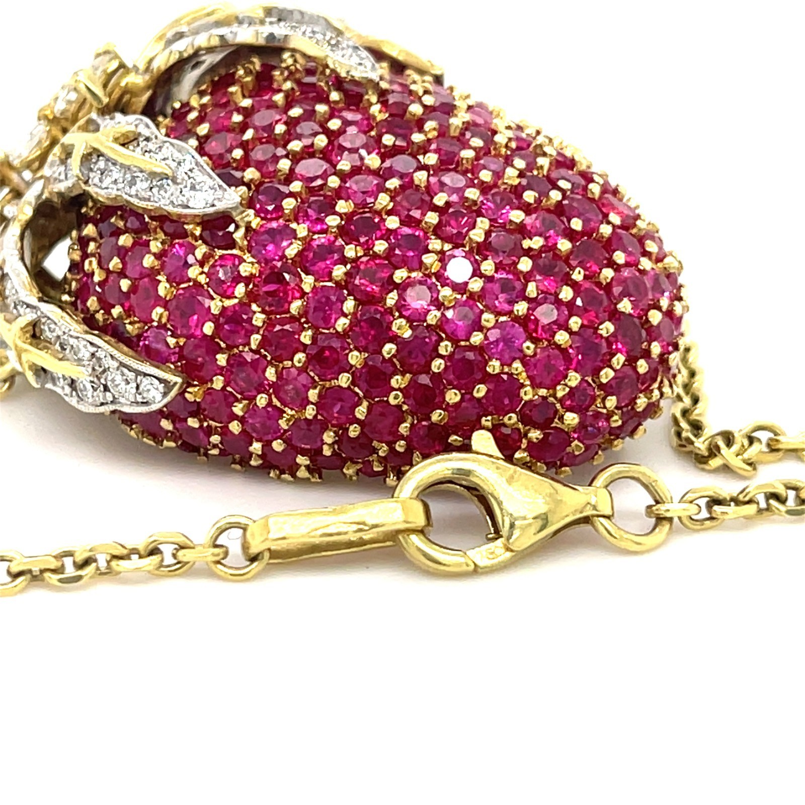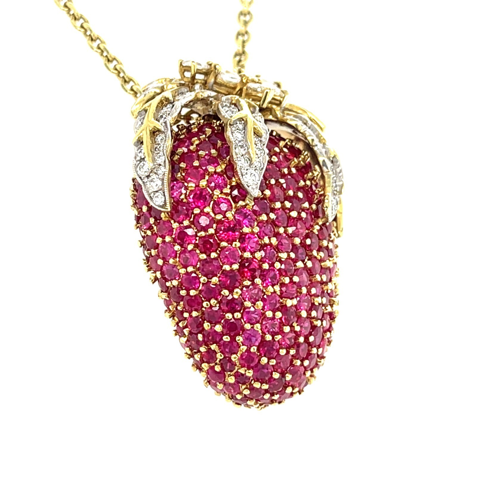 Ciondolo/spilla a forma di fragola con rubino da 10 ct e diamante da 1,5 ct, in oro giallo 18 kt, con catena da 45,7 cm