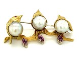 18k Yellow Gold Cultured Pearl Three Birds Sitting Brooch with Rubies