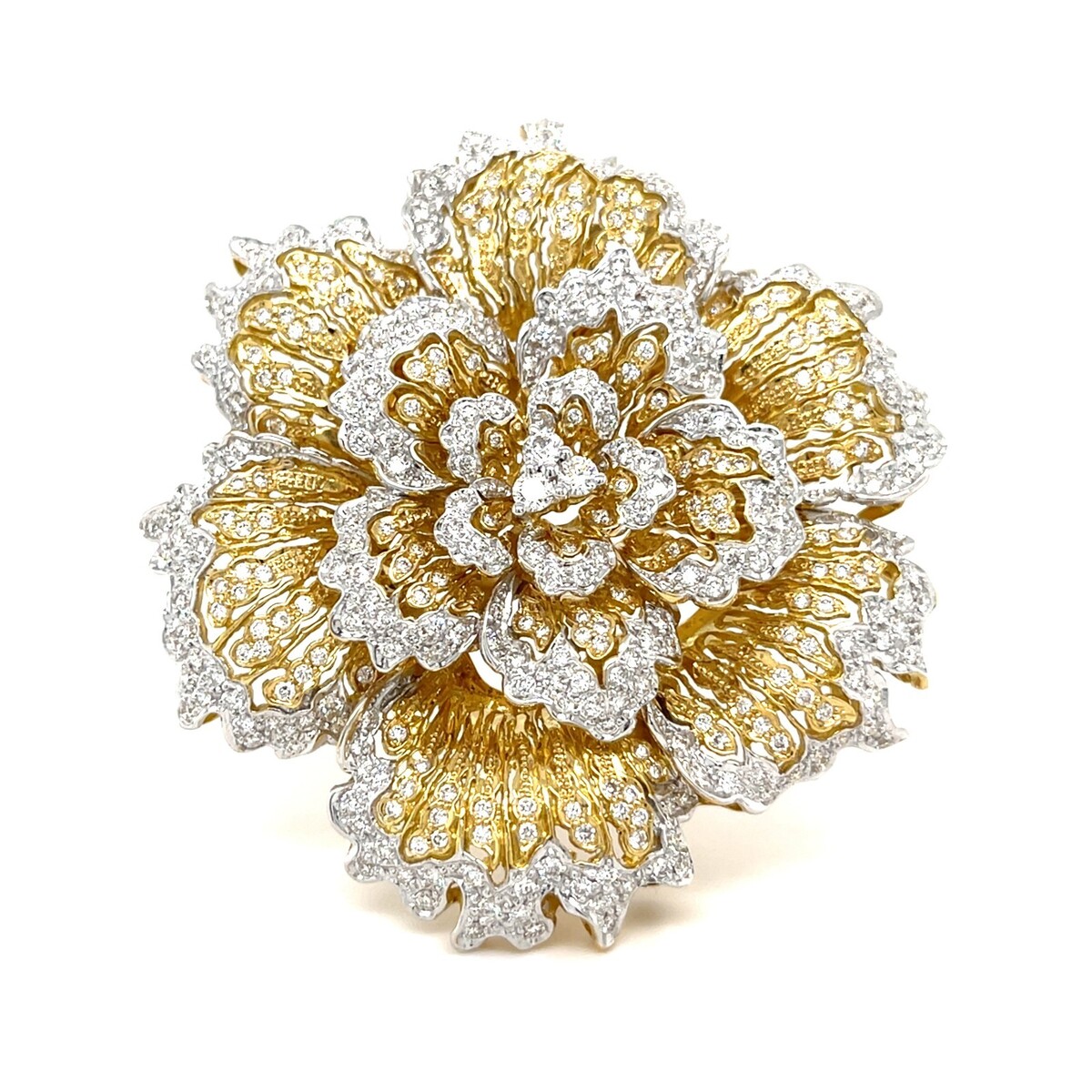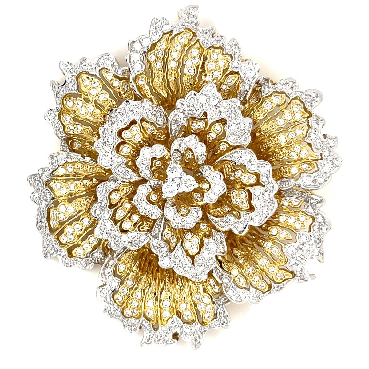 18k Zwei Ton Gold Groß Blume Brosche W / 4.15 Karat Diamanten Atemberaubend
