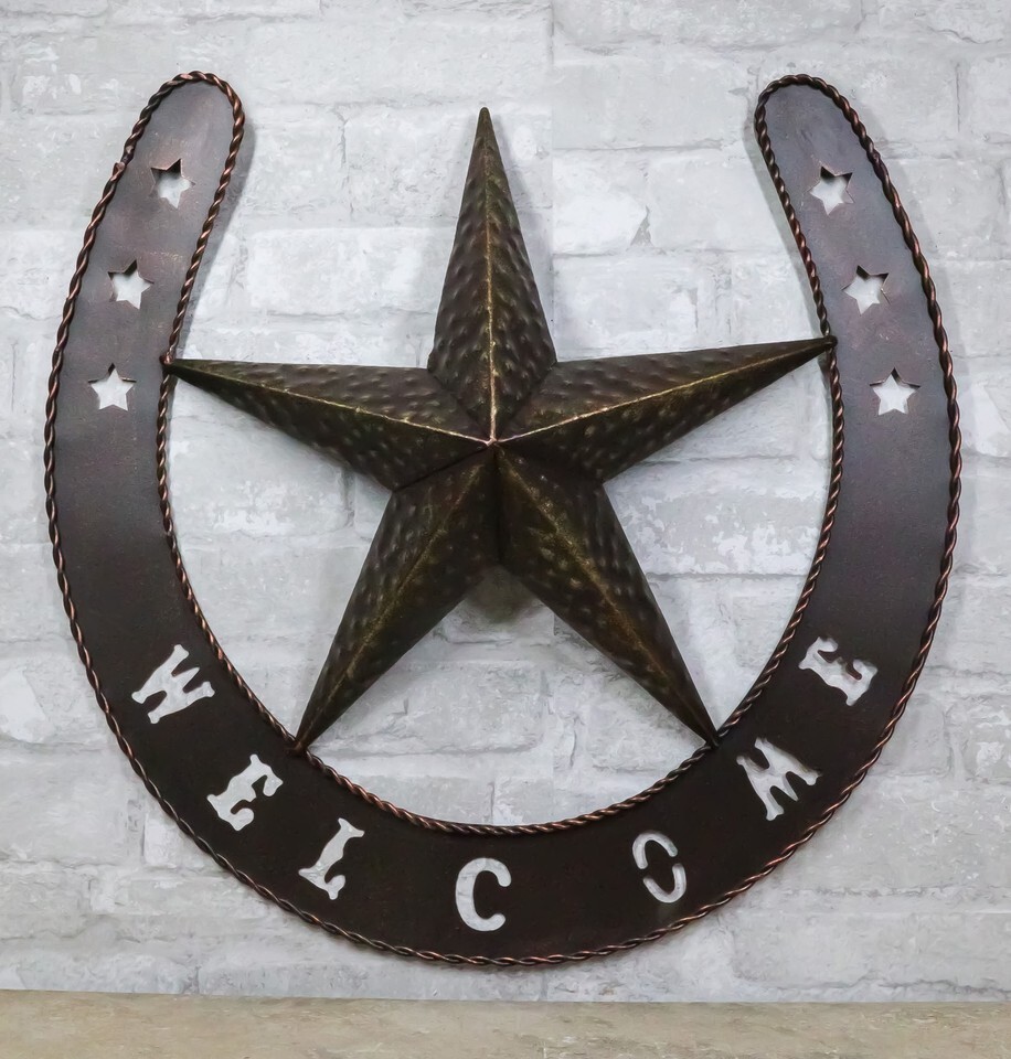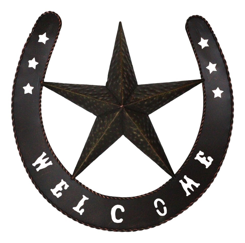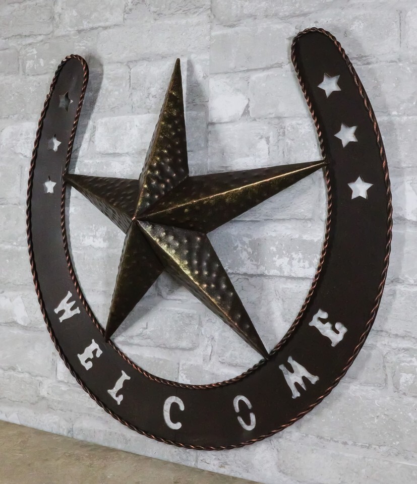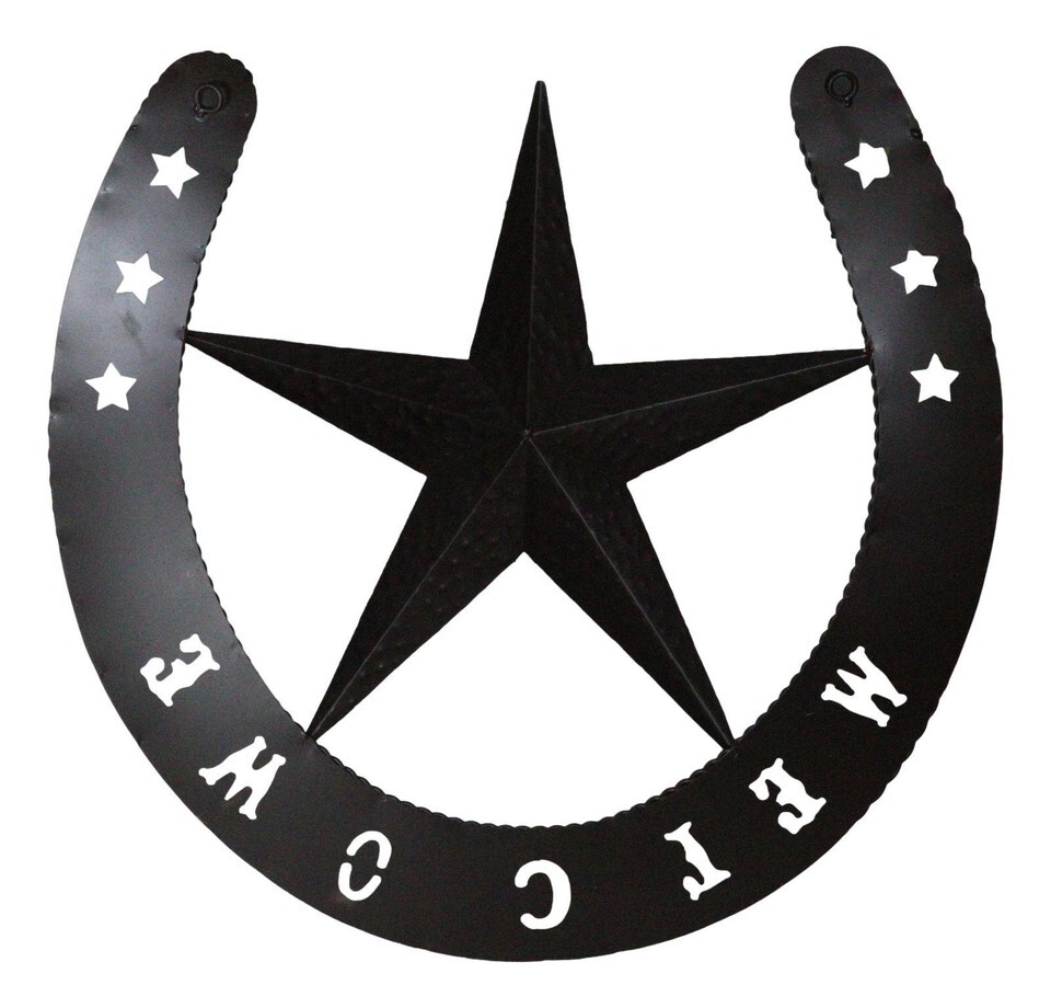 ? This rustic giant horseshoe with western star welcome sign is made of aluminum, hand painted and polished individually.