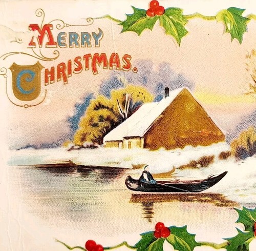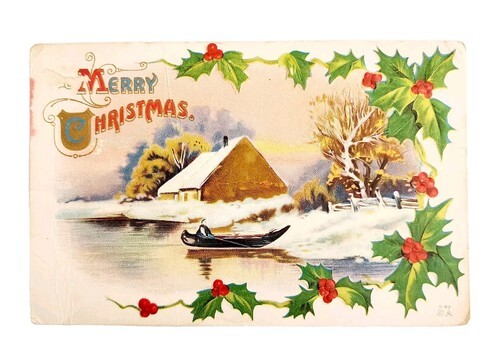 - 1900s Greeting Card Postcard Merry Christmas Winter Scene Cabin Embossed E83B