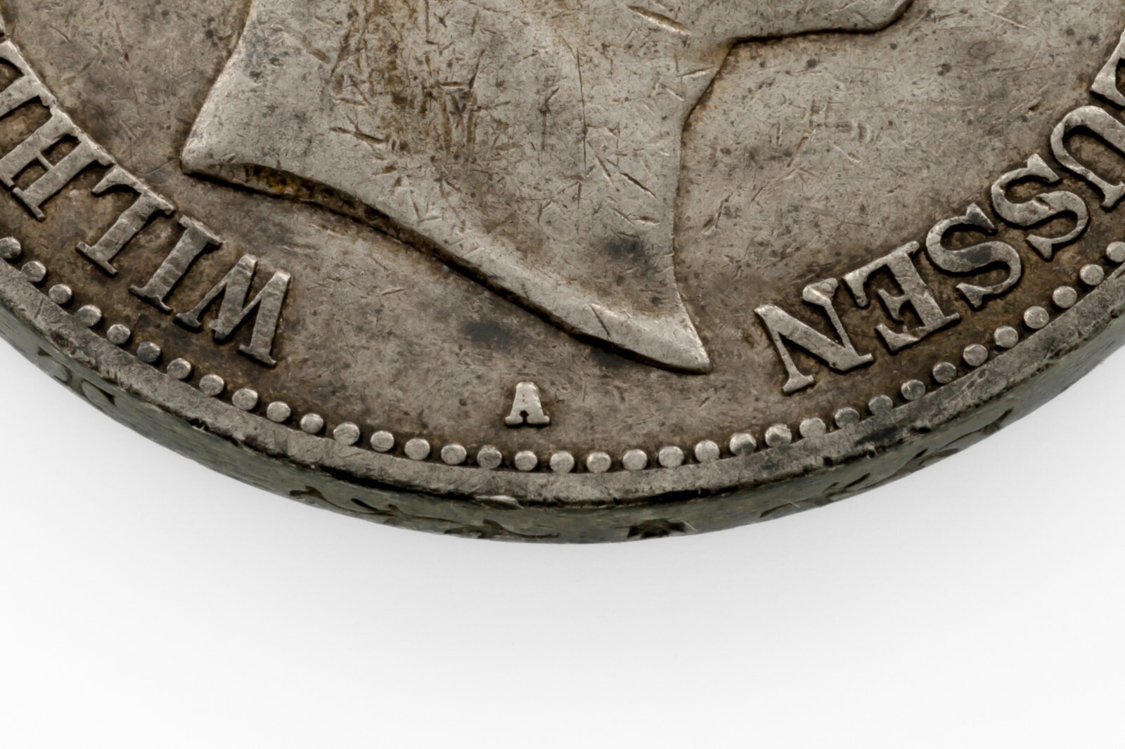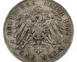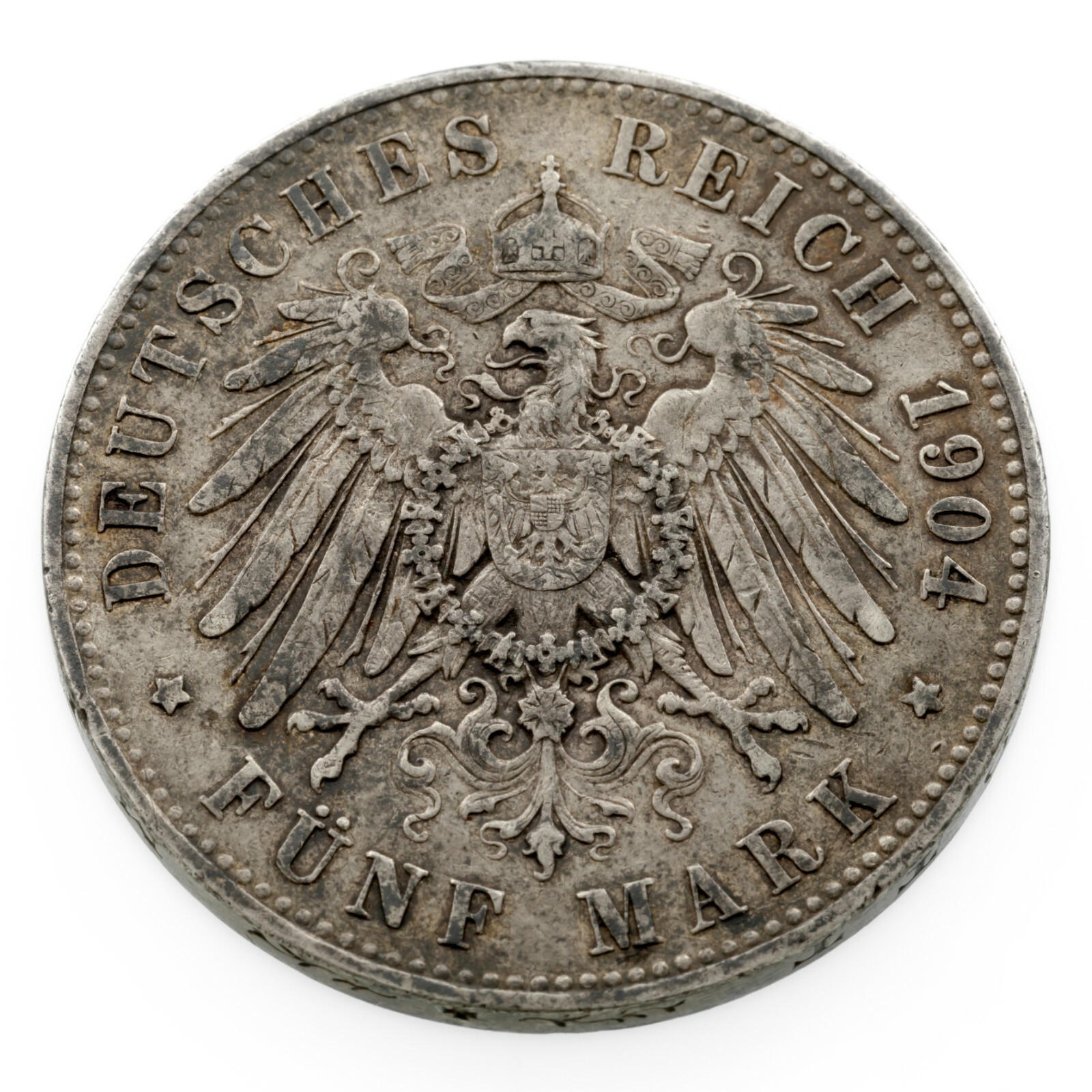 - 1904A German States Prussia 5 Mark Silver Coin in XF, KM 523
