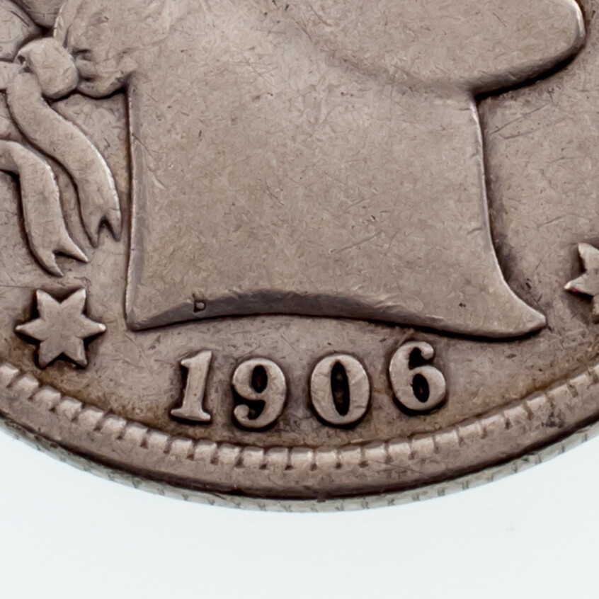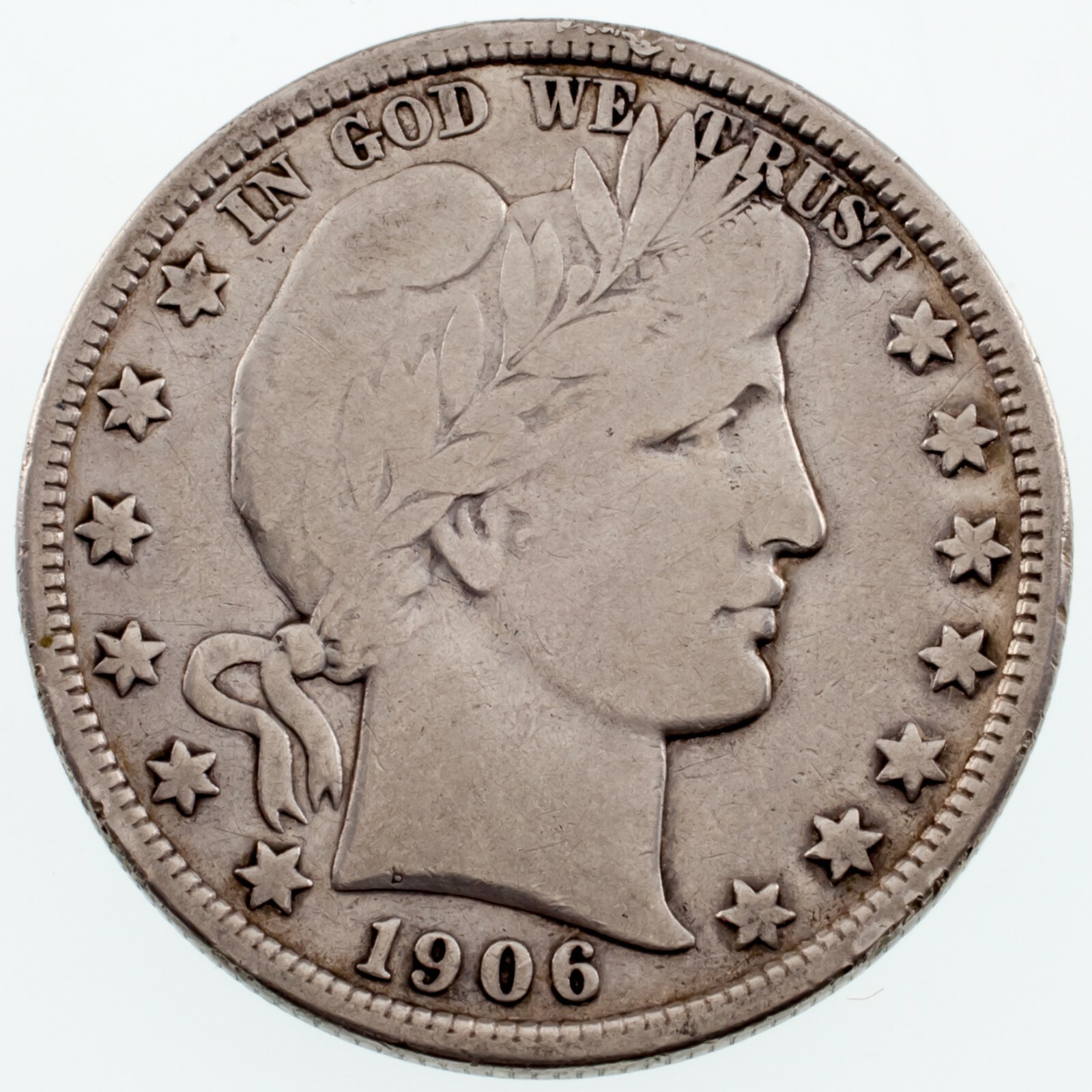 1906-d 50c Barber demi-dollar en fin, couleur gris clair