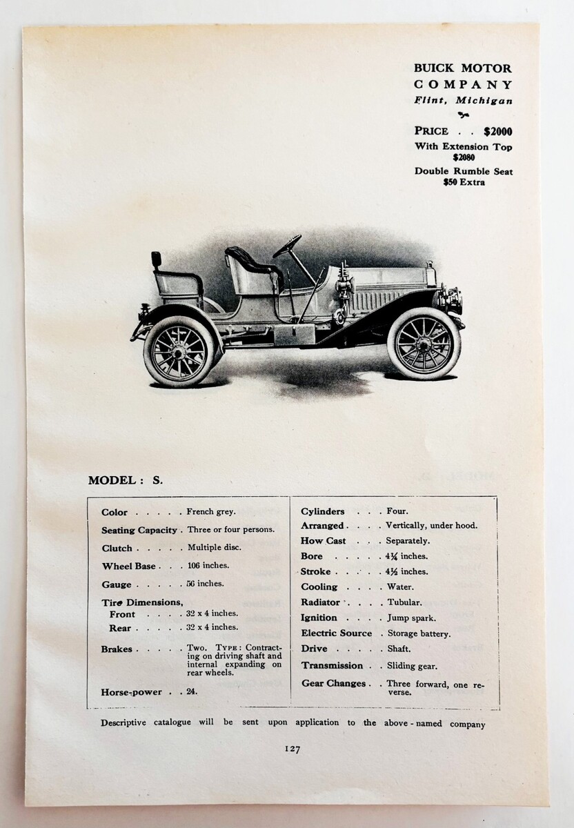 - 1908 Buick Motor Co Model S Print Catalog Advertisement Automobilia F14G