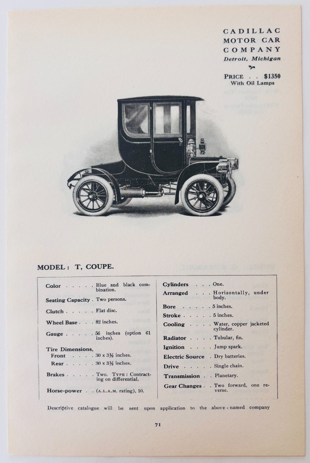 1908 Cadillac Model T Coupe Vehicle Catalog Advertisement Automobilia F17M2