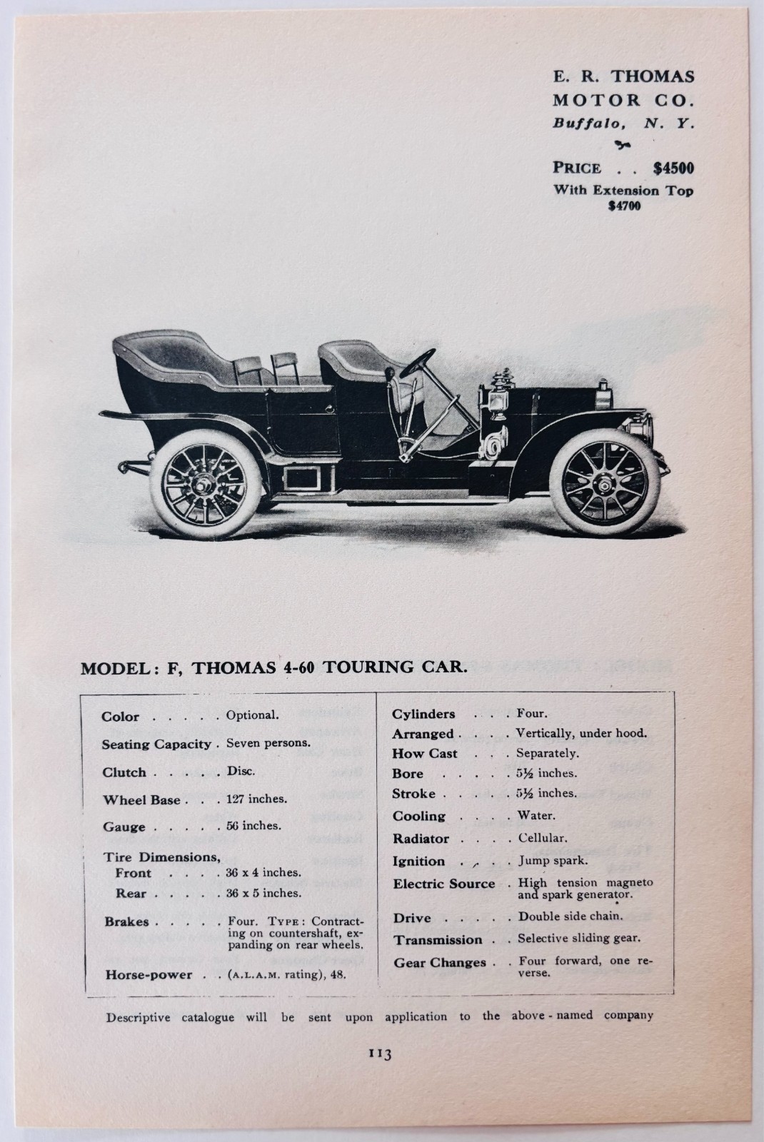 1908 E.R. Thomas Model F 4-60 Touring Catalog Advertisement Automobilia F17M1