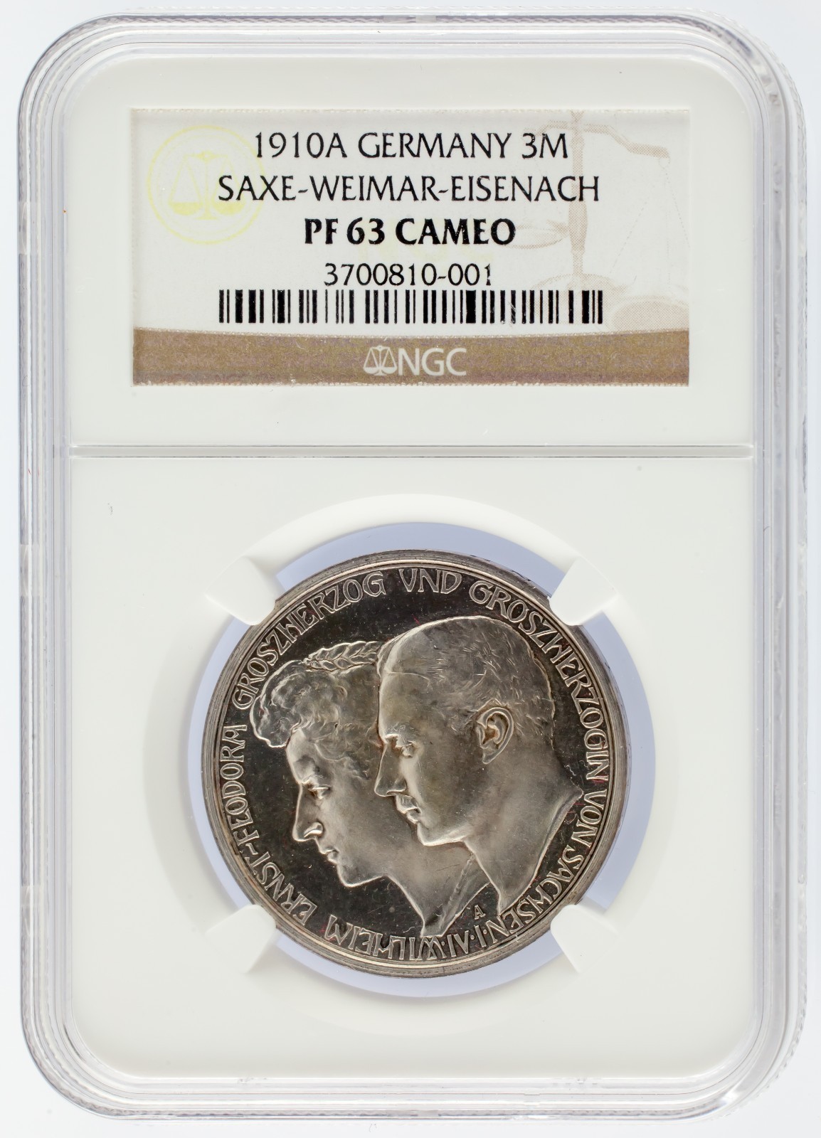 - 1910 A Germany 3 Mark 3M Saxe-Weimar-Eisenach Silver NGC Graded PF63 Cameo