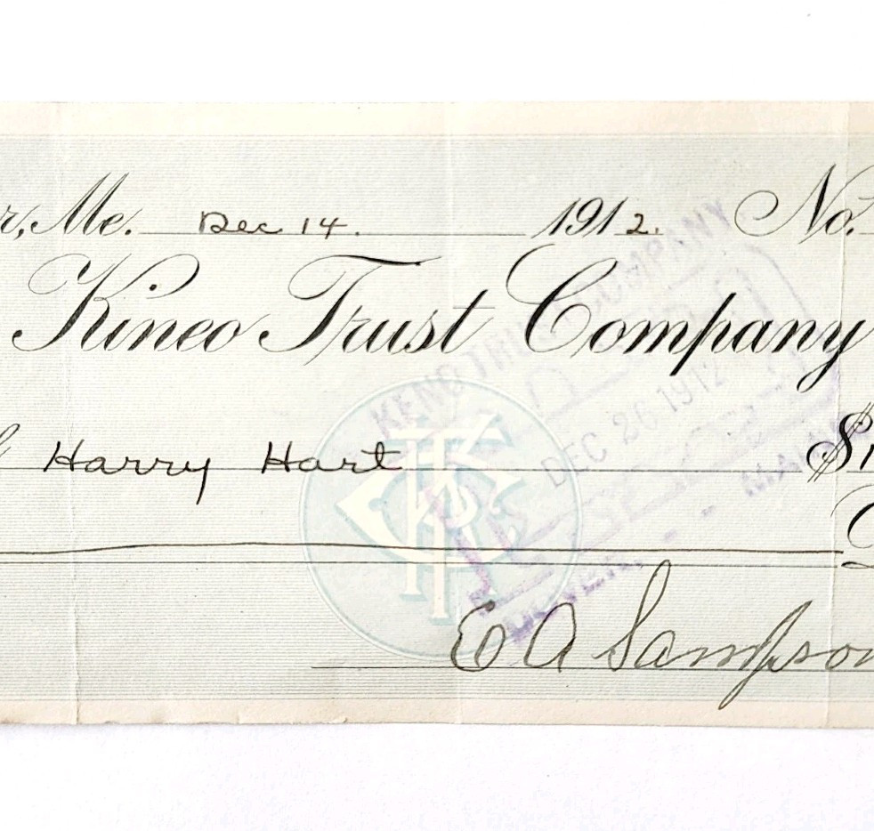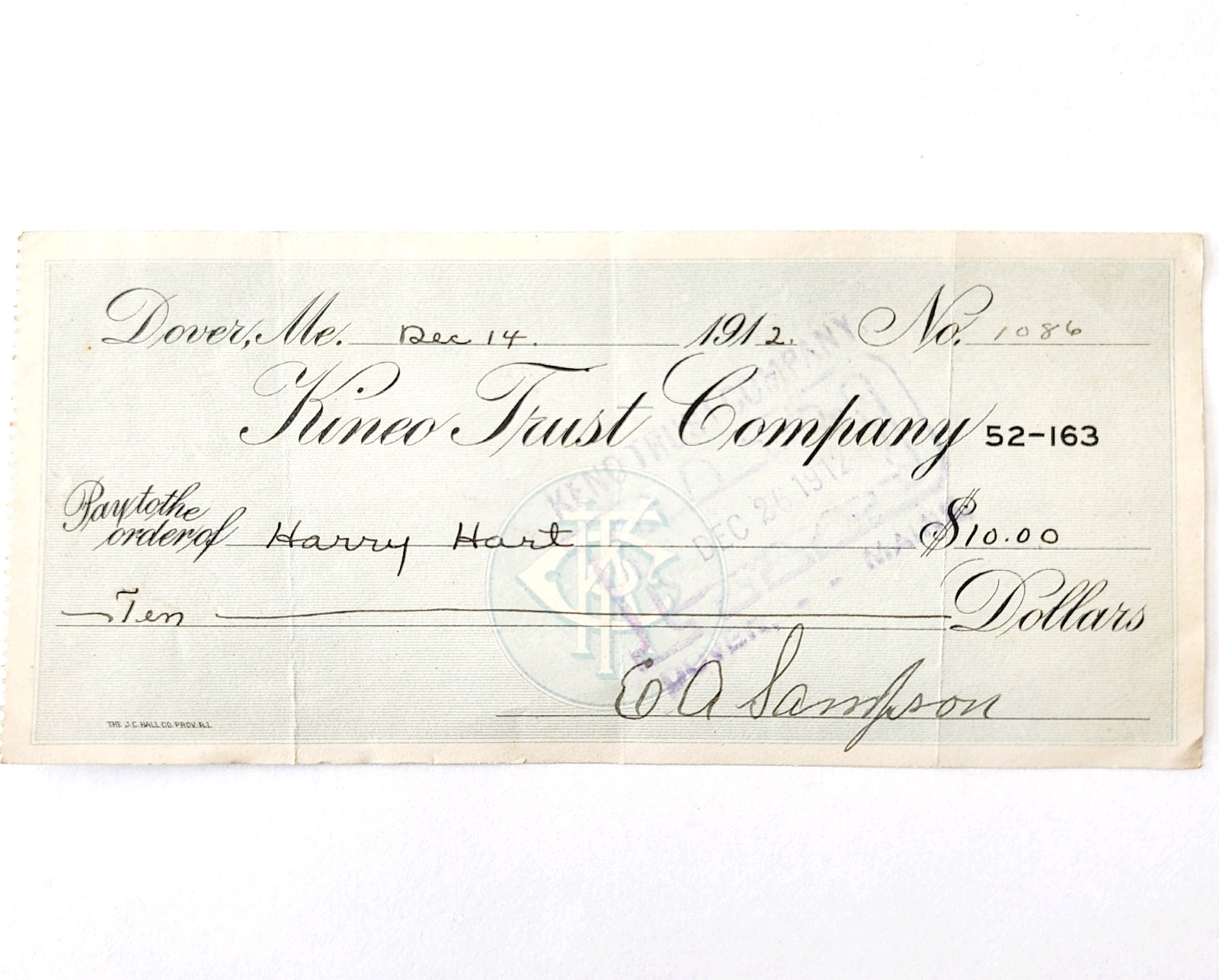 - 1912 Kineo Trust Company Bank Check E.A. Sampson Dover Maine Signed 1086 CHX4