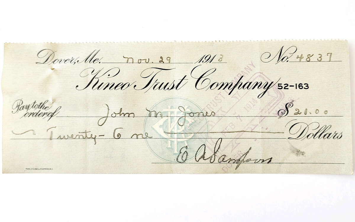 - 1913 Kineo Trust Company Bank Check E.A. Sampson Dover Maine Signed 4837 CHX7