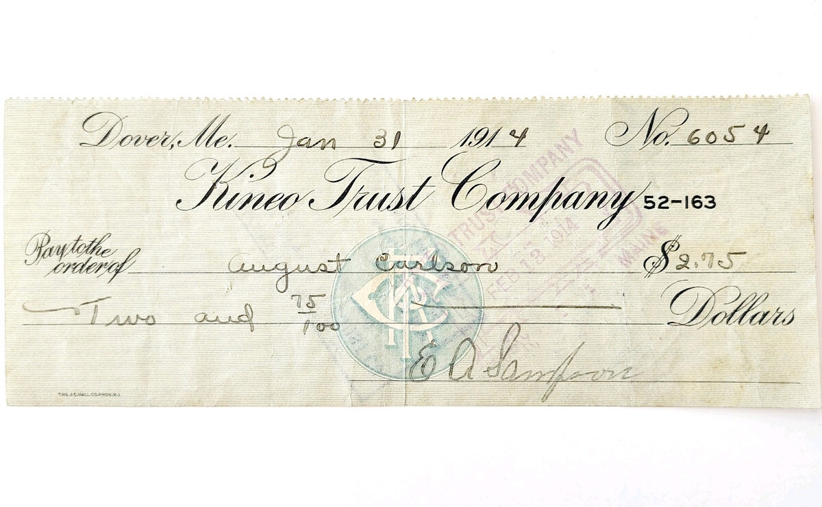 - 1914 Kineo Trust Company Bank Check E.A. Sampson Dover Maine Signed 6054 CHX10