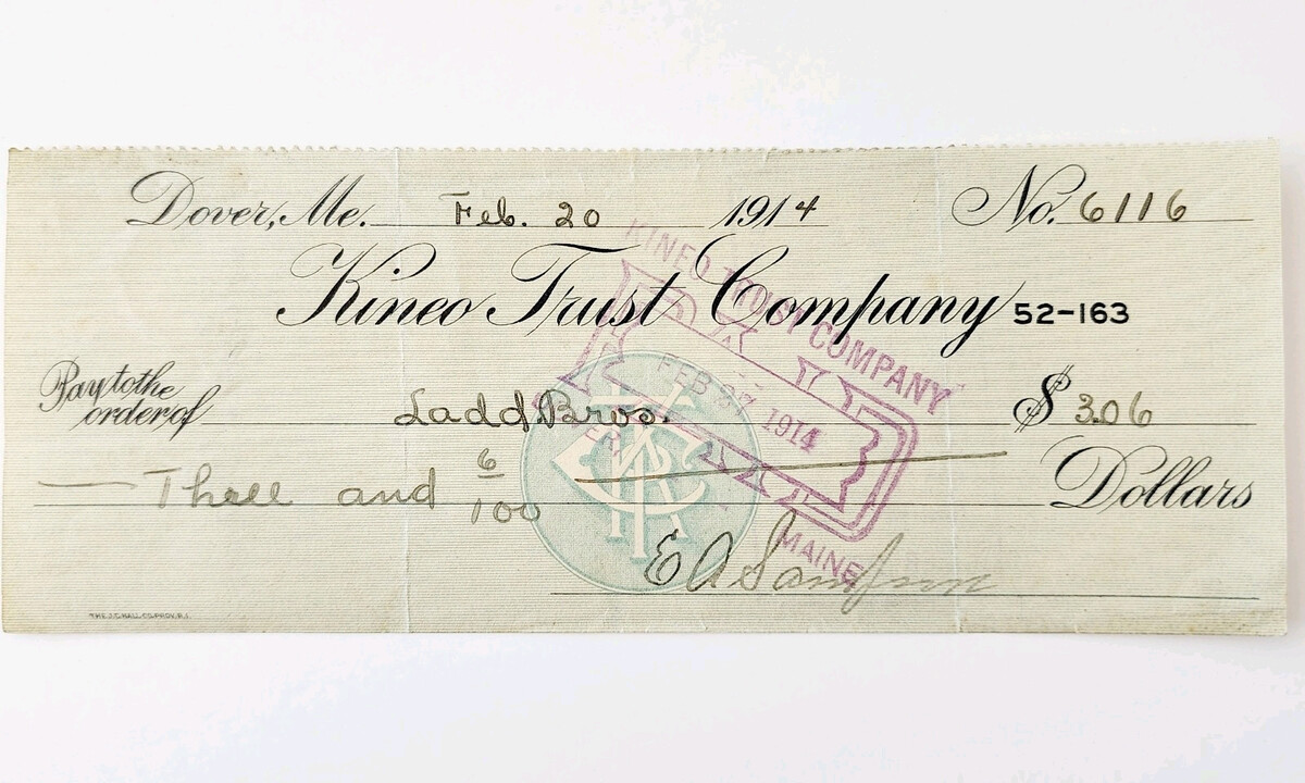 1914 Kineo Trust Company Bank Check E.A. Sampson Dover Maine Signed 6116 CHX8
