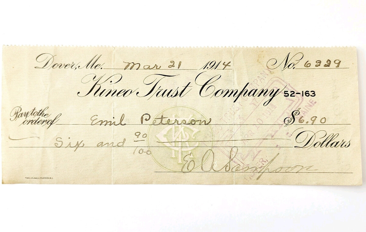 1914 Kineo Trust Company Bank Check E.A. Sampson Dover Maine Signed 6229 CHX8