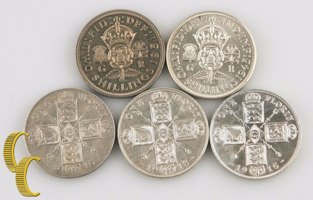 1915-1951 Großbritannien Florin, 2 Shillings Lot (5 Münzen)