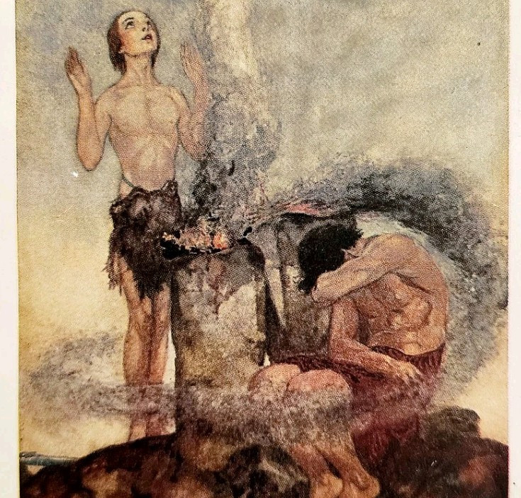 - 1916 Abel's Sacrifice Color Plate Print Willy Pogany Art Bible Story Cain E17G