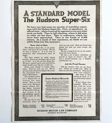 1916 Hudson Motors Standard Super Six Advertisement Automobilia Ephemera DWMYC3