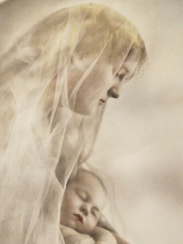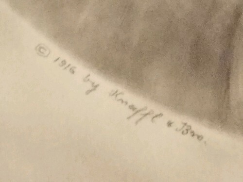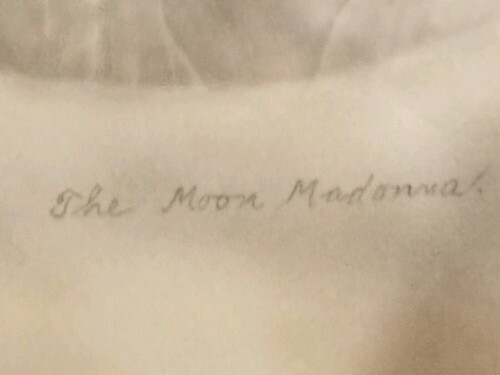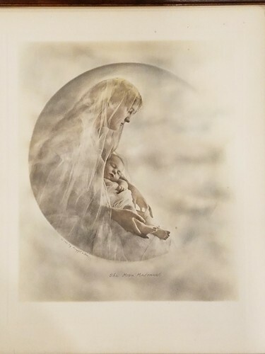 Up for sale is a a Rare 1916 Knaffl Bro. Print Titled: "The Moon Madonna". The print features Mother Child on a Crescent Moon. The print measures approx. 13.5" X 16.5" and was produced by Knaffl Bro. (Joseph and Charles Knaffl) which was located in Knoxville, TN, and started in 1884. They specialized in art photography and this is a variation of one of their more-well known works-- The Knaffl Madonna.