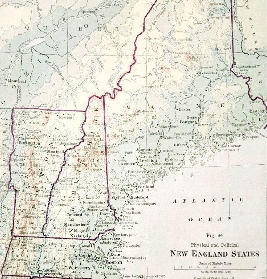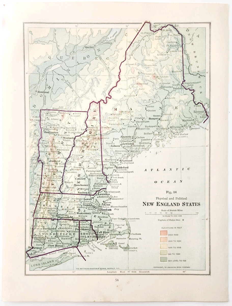 1916 Map New England States Physical Political Maine NH Mass CT RI Vermont DWSS8
