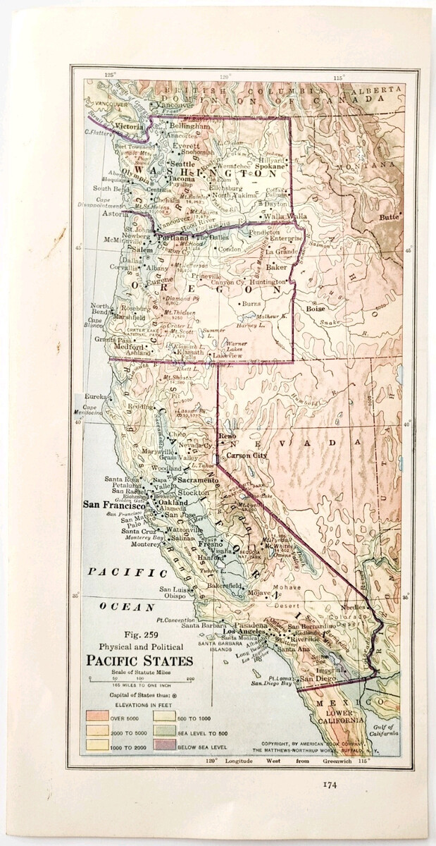 - 1916 Map Pacific States USA Physical Political Cali Nevada Oregon PNW DWSS8